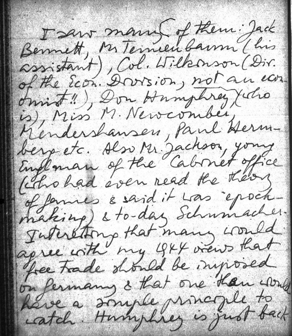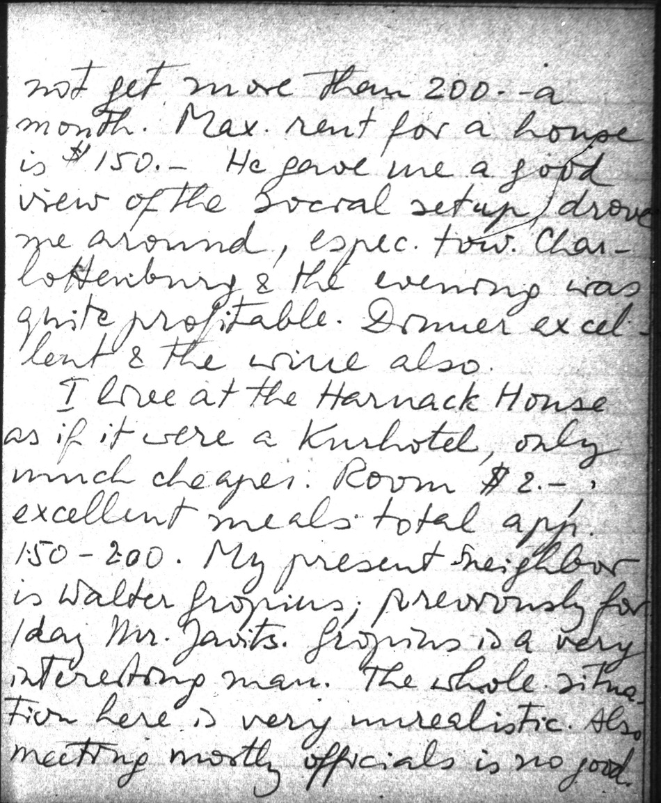 I live at the Harnack House as if it were a Kurhotel, only much cheaper. Room $ 2.-; excellent meaels total app. 1.50-2.00. My present neighbor is Walter Gropins; previously for 1 day Mr. Javits. Gropins is a very interesting man. The whole situation is very unrealistic. Also meeting mostly officials is no good. I saw many of them: Jack Bernett, Mr Tennenbaum (his assistant), Col. Wilkinson (Dir. of the Econ. Division, not an economist!!), Don Humphrey, (who is), Miss M. Newcomber, Mendershausen, Paul Hermberg etc. Also Mr. Jackson, young Engl.man of the Cabinet office (who had even read the theory of games & said it was epoch-making) & to-day Schumacher. Interesting that many would agree with my 1944 views that free trade should be imposed on Germany & that one then would have a simple principle to watch. Humphrey is just back from Italy & is impressed with the dropping of controls there & the great ensuring activity. Now many think that one should have some inflation here too. I am not so much concerned with the immediate policy but rather with the fundamental goals down my main thoughts but they should be elaborated. Perhaps I shall write a memo when I am back in Princeton & either publish it as an article or send it to the State Dpt. From the first point of view (immediate policy) it would be interesting to see the italian scene. I shall have to decide that soon. There are app. 5 weeks left; but I would like some rest, of one continuous week.