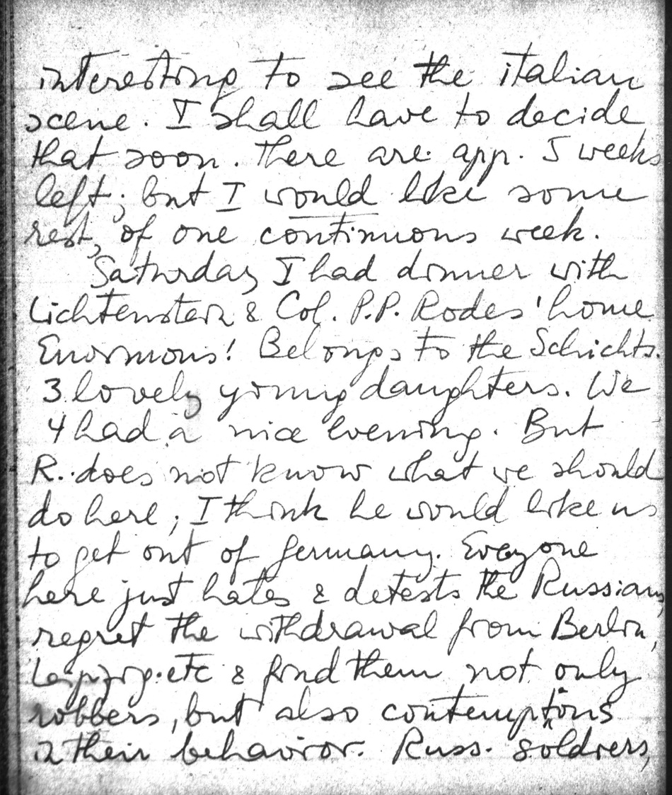 Saturday I had dinner with Lichtenstein & Col.P.P. Rodes home Enormous! Belongs to the Schichts. 3 lovely young daughters. We 4 had a nice evening. But R. does not know what we should do here; I think he would like us to get out of Germany. Everyone here just hates & detests the Russians, regret the withdrawal from Berlin, Leipzig etc & find them not only robbers, but also contemptuous in their behavior. Russ. soldiers, incidentally, are not allowed outside of barracks. Nobody accepts any invitations, any intercourse etc, exactly as in Vienna. One must not even photograph in the russian sector of B! What a different world here in the US sector & at Angus.