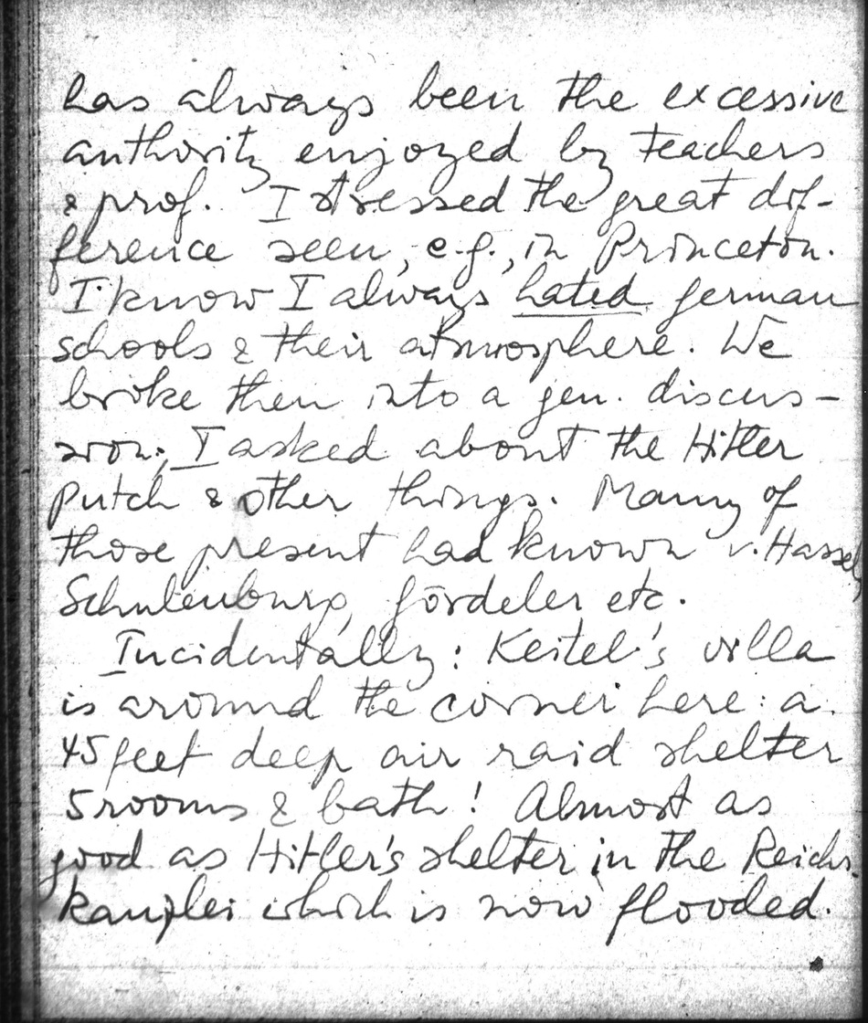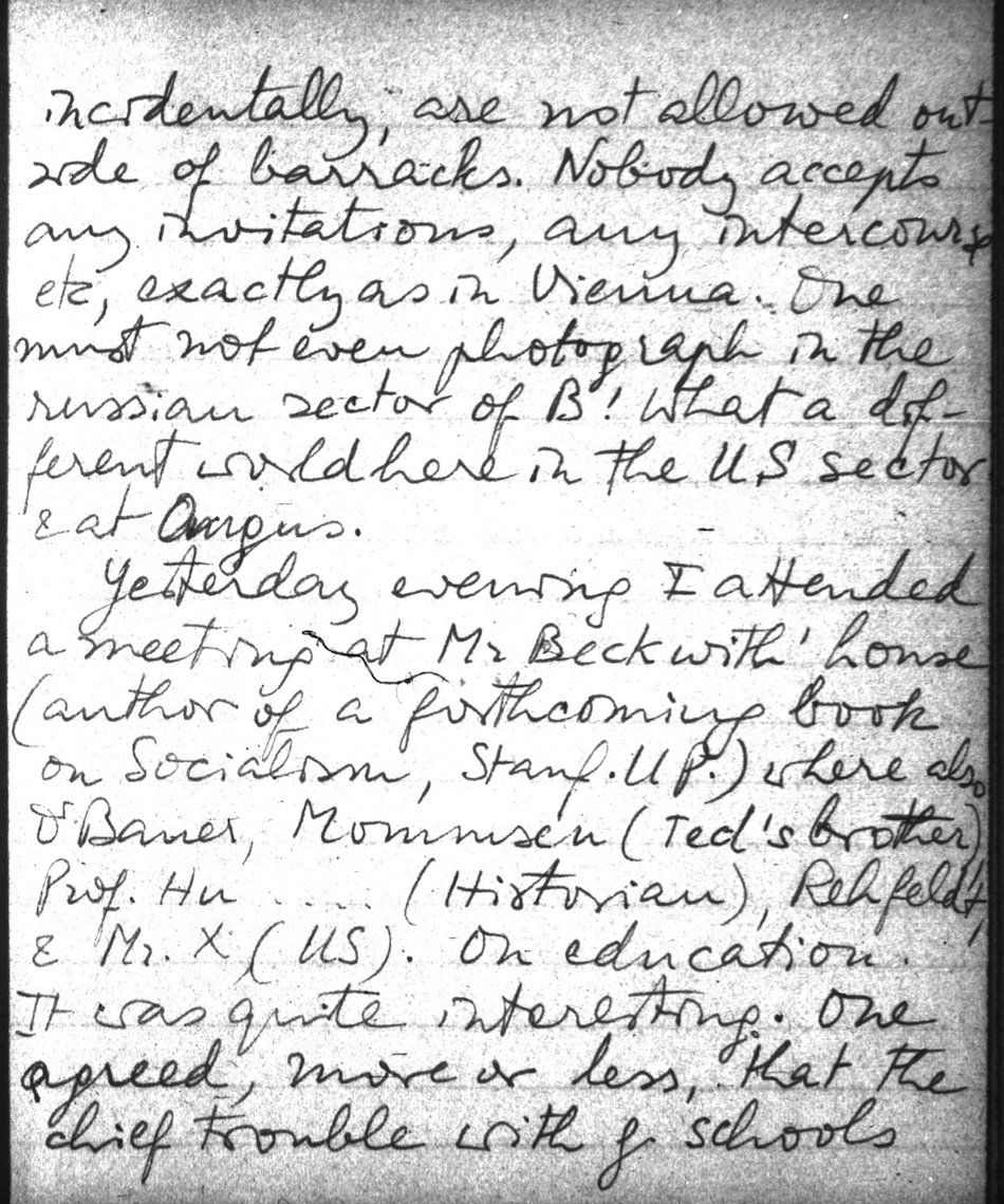 Yesterday evening I attended a meeting at Mr Beckwith house (author of a forthcoming book on Socialism, Stanf. UP.) where also Dr Bauer, Mommsen (Teds brother) Prof. Hu . (Historian), Rehfeldt, & Mr. X (US). On education. It was quite interesting. One agreed, more or less, that the chief trouble with G. schools has always been the excessive authority enjoyed by teachers & prof. I stressed the great difference seen, e.g., in Princeton. I know I always hated German schools & their atmosphere. We broke then into a gen. discussion; I asked about the Hitler Putch & other things. Many of those present had known v. Hassel, Schulenburg, Gördeler etc.
