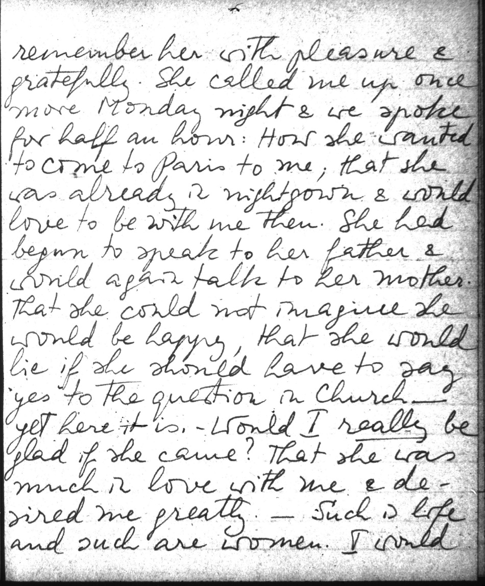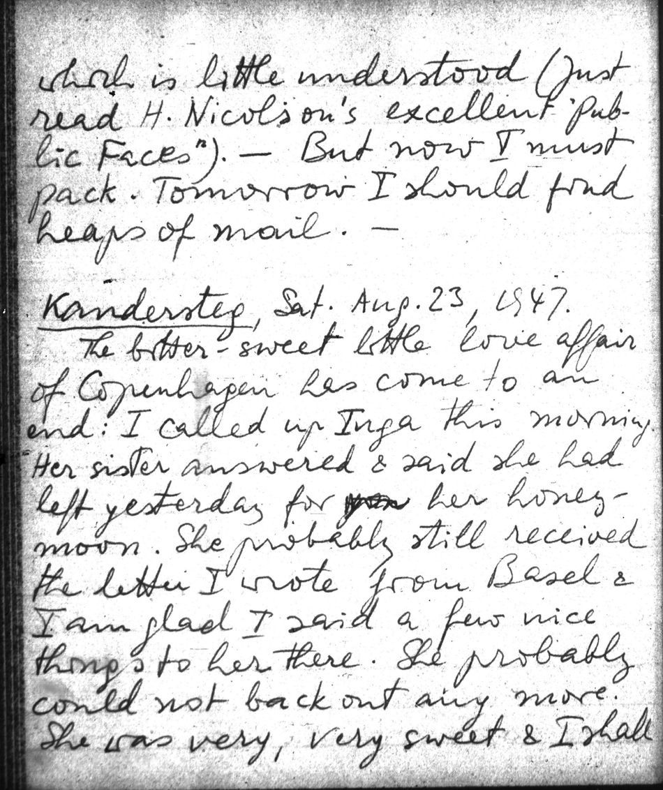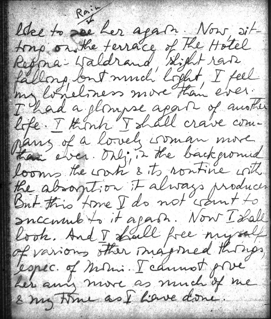The bitter-sweet little love affair of Copenhagen has come to an end: I called up Inga this morning. Her sister answered & said she had left yesterday for her honeymoon. She probably still received the letter I wrote from Basel & I am glad I said a few nice things to her there. She probably could not back out any more. She was very, very sweet & I shall remember her with pleasure & gratefully. She called me up once more Monday night & we spoke for half an hour: How she wanted to come to Paris to me; that she was already in nightgown & would love to be with me then. She had begun to speak to her father & would again talk to her mother. That she could not imagine she would be happy, that she would lie if she should have to say yes to the question in Church yet here it is. Would I really be glad if she came? That she was much in love with me & desired me greatly. Such is life and such are women. I would like to see her again [Rain]. Now, sitting on the terrace of the Hotel Regina-Waldrand, slight rain falling, but much light, I feel my loneliness more than ever. I had a glimpse again of another life. I think I shall crave company of a lovely woman more than ever. Only, in the background looms the work & its routine with the absorption it always produces. But this time I do not want to succumb to it again. Now I shall look. And I shall free myself of various other imagined things, espc. of Mimi. I cannot give her any more as much of me & my time as I have done.