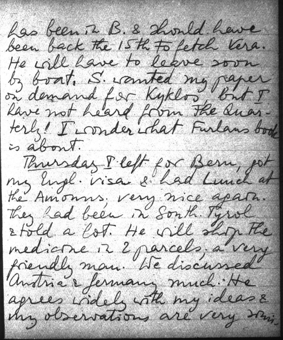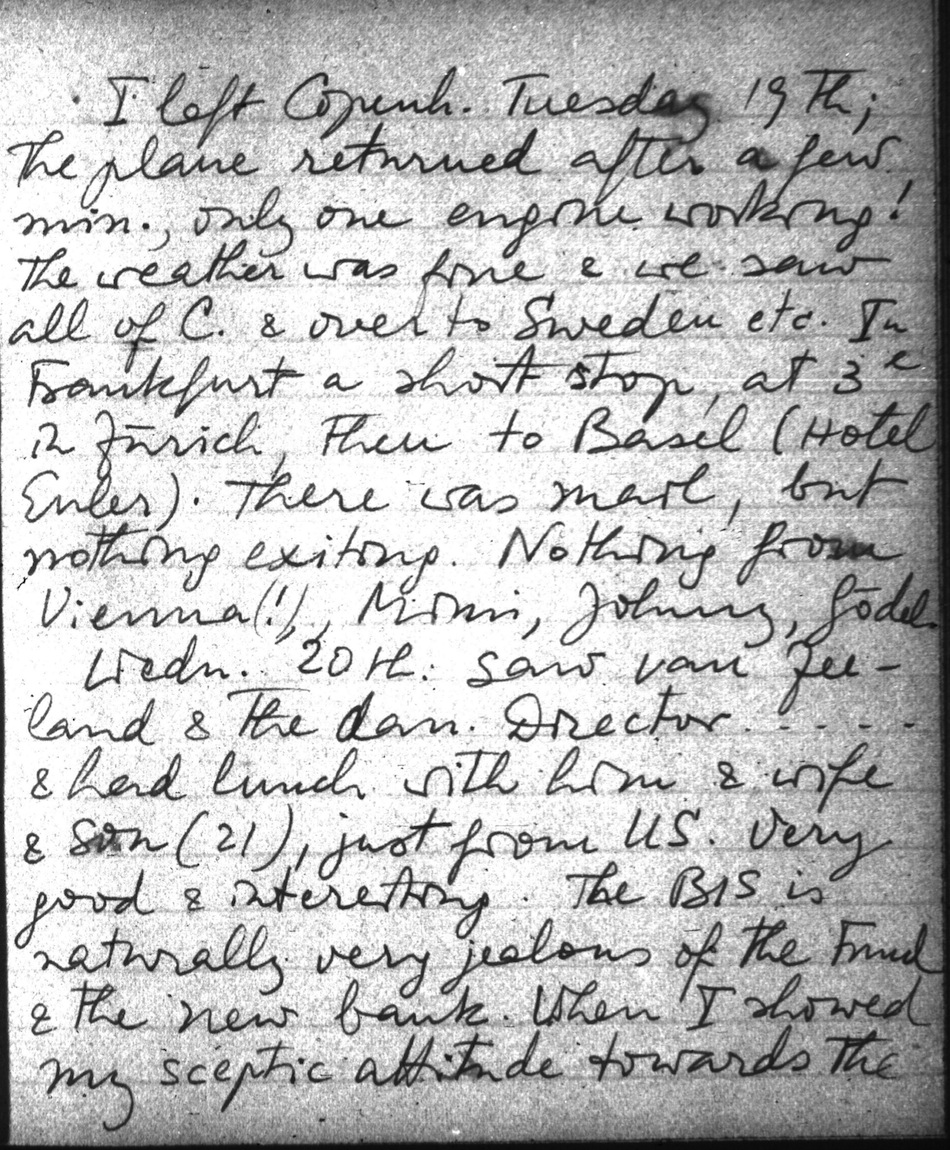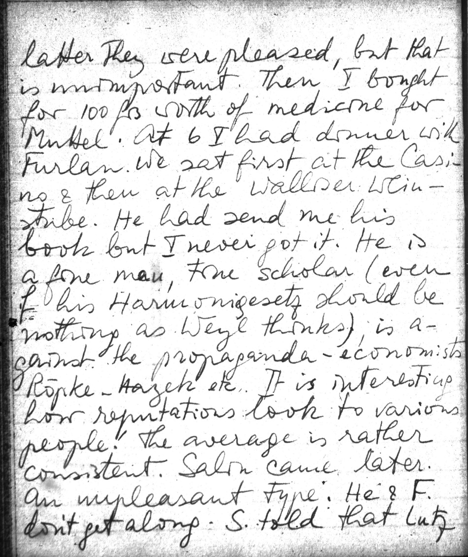 Wedn. 20 th: saw van Zeeland & the dan. Director .. & had lunch with him & wife & son (21), just from US. Very good & interesting. The BIS is naturally very jealous of the French & the new bank. When I showed my sceptic attitude towards the latter they were pleased, but that is unimportant. Then I bought for 100 frs worth of medicine for Muttel. At 6 I had dinner with Furlan. We sat first at the Casino & then at the Walliser Weinstube. He had send me his book but I never got it. He is a fine man, fine scholar (even if his Harmonigesetz should be nothing as Weyl thinks), is against the propaganda-economists Röpke Hayek etc. It is interesting how reputations look to various people! The average is rather consistent. Salin came later. An unpleasant type. He & F. dont get along. S. told that Lutz has been in B. & should have been back the 15th to fetch Vera. He will have to leave soon by boat. S. wanted my paper on demand for Kyklos, but I have not heard from the Quarterly! I wonder what Furlans book is about.