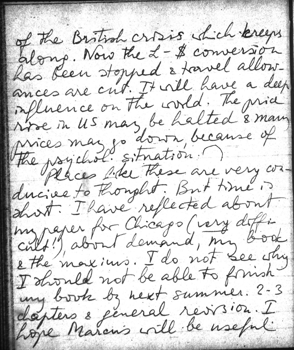 Places like these are very conducive to thought. But time is short. I have reflected about my paper for Chicago (very difficult!), about demand, my book & the maxims. I do not see why I should not be able to finish my book by next summer. 2-3 chapters & general revision. I hope Marcus will be useful. Katherine Bell wrote & is back at work.
