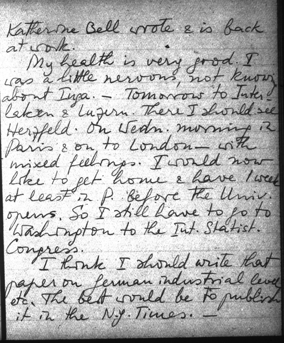 My health is very good. I was a little nervous, not knowing about Inga. Tomorrow to Interlaken & Luzern. There I should see Herzfeld. On Wedn. morning in Paris & on to London with mixed feelings. I would now like to get home & have 1 week at least in P. before the Univ. opens. So I still have to go to Washington to the Int. Statist. Congress.