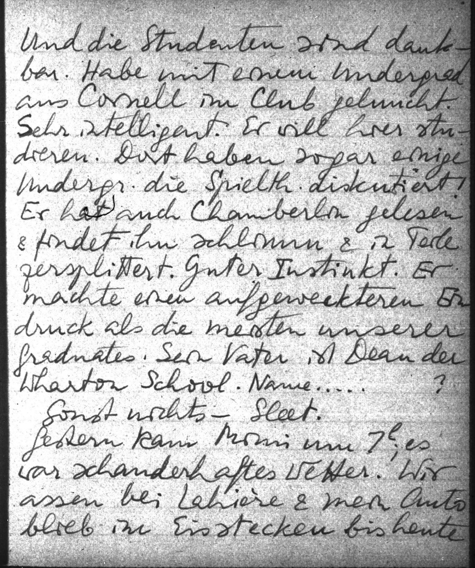 Die weiteren 4 x werde ich den Spielen widmen. Das macht eine Menge Arbeit & ich tue sonst nichts. Aber es ist so lohnend. Und die Studenten sind dankbar. Habe mit einem Undergrade aus Cornell im Club geluncht. Sehr intelligent. Er will hier studieren. Dort haben sogar einige Undergr. die Spielth. diskutiert! Er hat auch Chamberlin gelesen & findet ihn schlimm & in Teile zersplittert. Guter Instinkt. Er machte einen aufgeweckteren Eindruck als die meisten unserer Graduates. Wein Vater ist Dean der Wharton School. Name