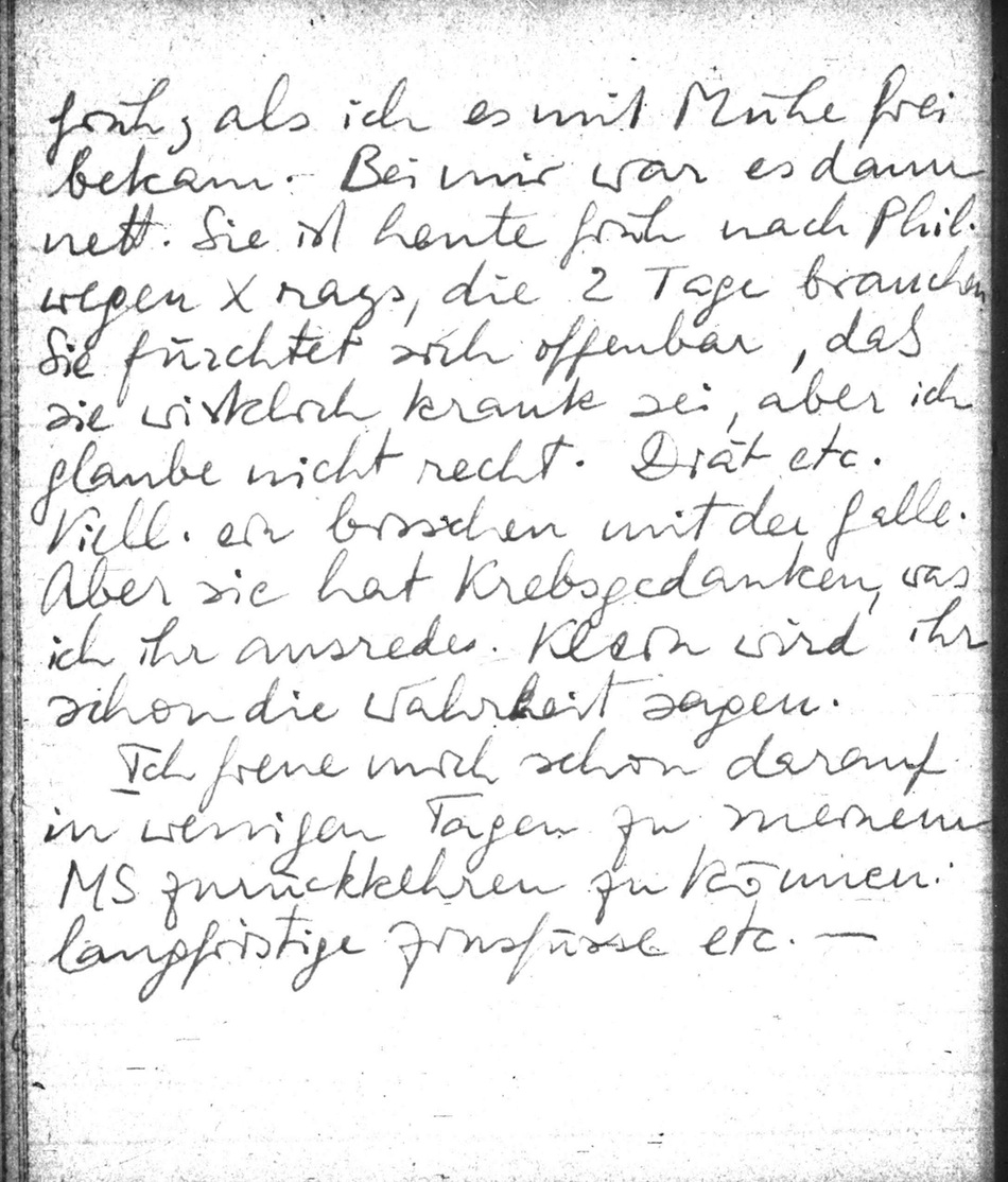 Gestern kam Mimi um 7h; es war schauderhaftes Wetter. Wir assen bei Lahière & mein Auto blieb im Eis stecken bis heute früh, als ich es mit Mühe frei bekam. Bei mir war es dann nett. Sie ist heute früh nach Phil. wegen X rays, die 2 Tage brauchen. Sie fürchtet sich offenbar, daß sie wirklich krank sei, aber ich glaube nicht recht. Diät etc. Viell. ein bisschen mit der Galle. Aber sie hat Krebsgedanken, was ich ihr ausrede. Klein wird ihr schon die Wahrheit sagen.