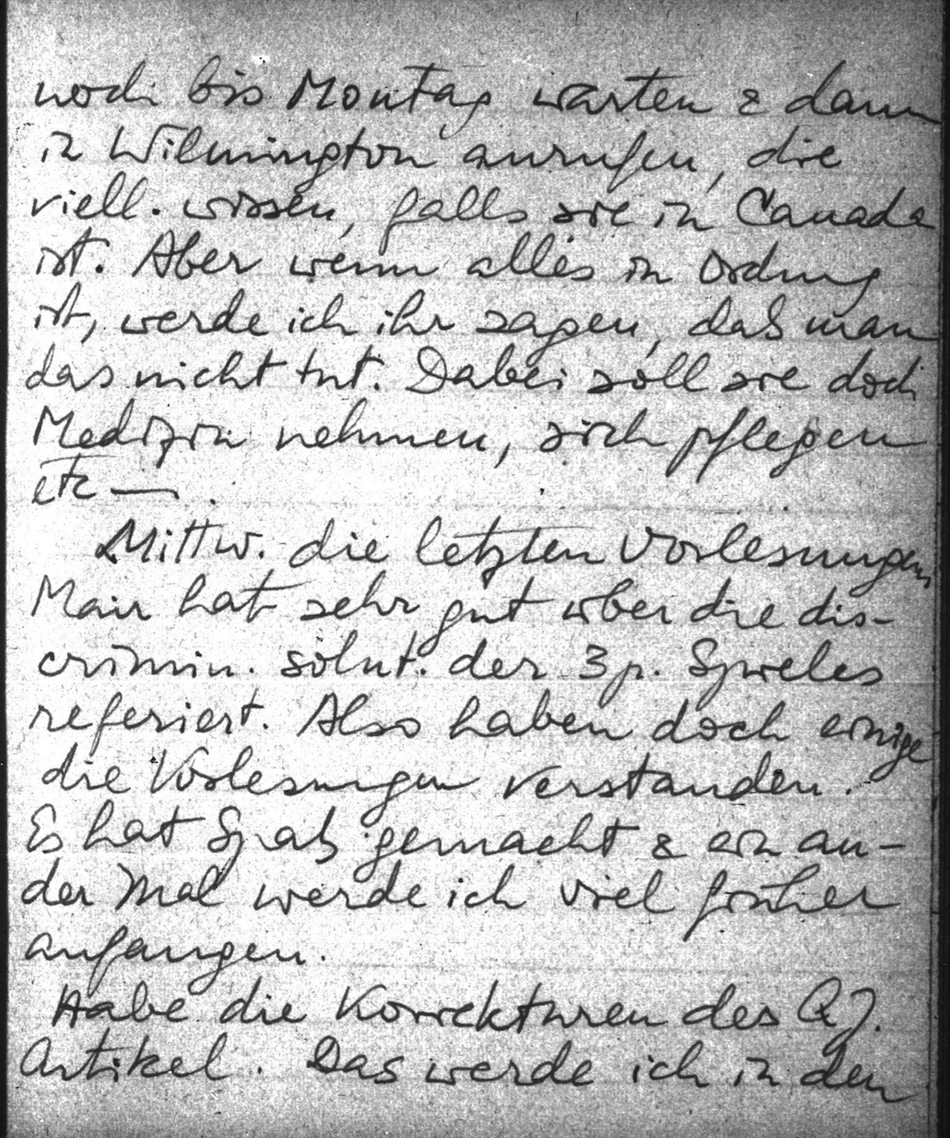 Noch immer nichts von Mimi gehört; ganz unklar. Ich hoffe, es ist ihr nichts passiert, aber ich kann die Befürchtung nicht los werden. War gestern in N.Y., war bei ihrer Wohnung, alles zu, der Portier weiss nichts. Ich werde noch bis Montag warten & dann in Wilmington anrufen, die viell. wissen, falls sie in Canada ist. Aber wenn alles in Ordnung ist, werde ich ihr sagen, daß man das nicht tut. Dabei soll sie doch Medizin nehmen, sich pflegen etc.