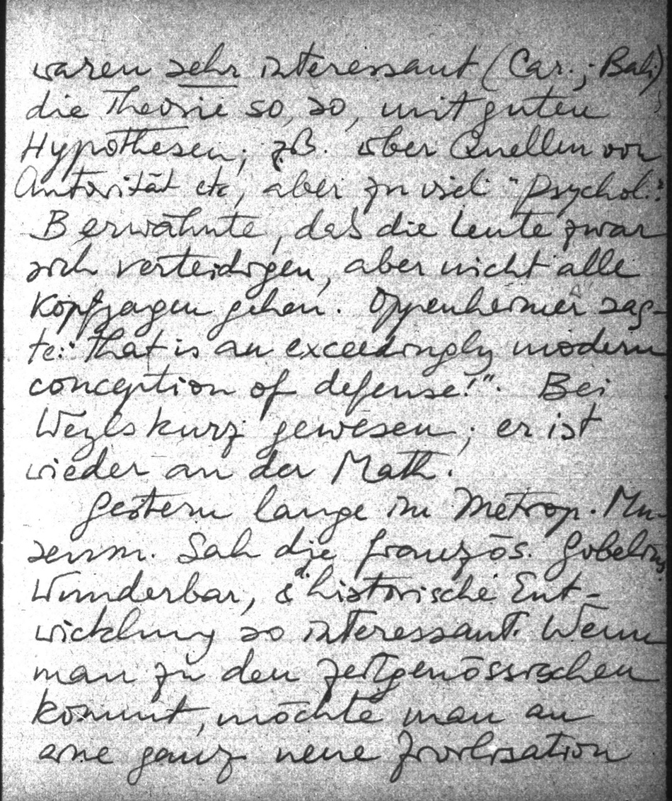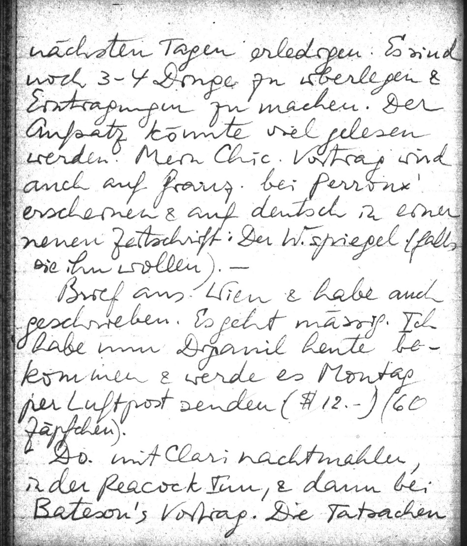 Do. mit Clari nachtmahlen, in der Peacock Inn, & dann bei Bateson's Vortrag. Die Tatsachen waren sehr interessant (Car., Bali), die Theorie so, so, mit guten Hypothesen; z.B. über Quellen von Autorität etc, aber zu viel "Psychol.". B erwähnte, daß die Leute zwar sich verteidigen, aber nicht alle Kopfjagen gehen. Oppenheimer sagte: "That is an exceedingly modern conception of defense!". Bei Weyls kurz gewesen; er ist wieder an der Math.