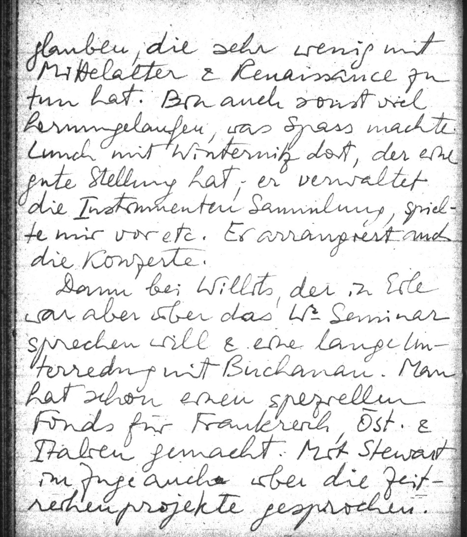Dann bei Willits, der in Eile war aber über das Wr Seminar sprechen will & eine lange Unterredung mit Buchanan. Man hat schon einen speziellen Fonds für Frankreich, Öst. & Italien gemacht. Mit Stewart im Zuge auch über die Zeitreihenprojekte gesprochen. Wir werden schon Geld bekommen.