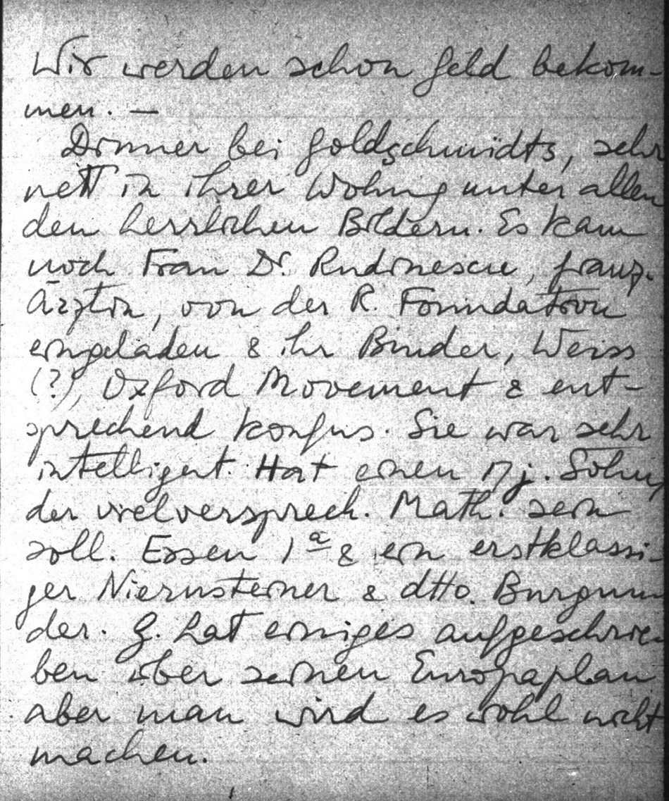 Dinner bei Goldschmidts, sehr nett in ihrer Wohnung unter allen den herrlichen Bildern. Es kam noch Frau Dr Rudinescu, franz. Ärztin, von der R. Foundation eingeladen & ihr Bruder, Weiss (?), Oxford Movement & entsprechend konfus. Sie war sehr intelligent. Hat einen 17j. Sohn, der vielversprech. Math. sein soll. Essen 1a & ein erstklassiger Niernsteiner & dtto Burgunder. G. hat einiges aufgeschrieben über seinen Europaplan aber man wird es wohl nicht machen.