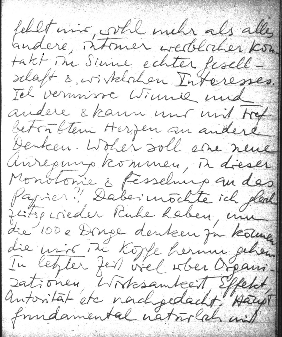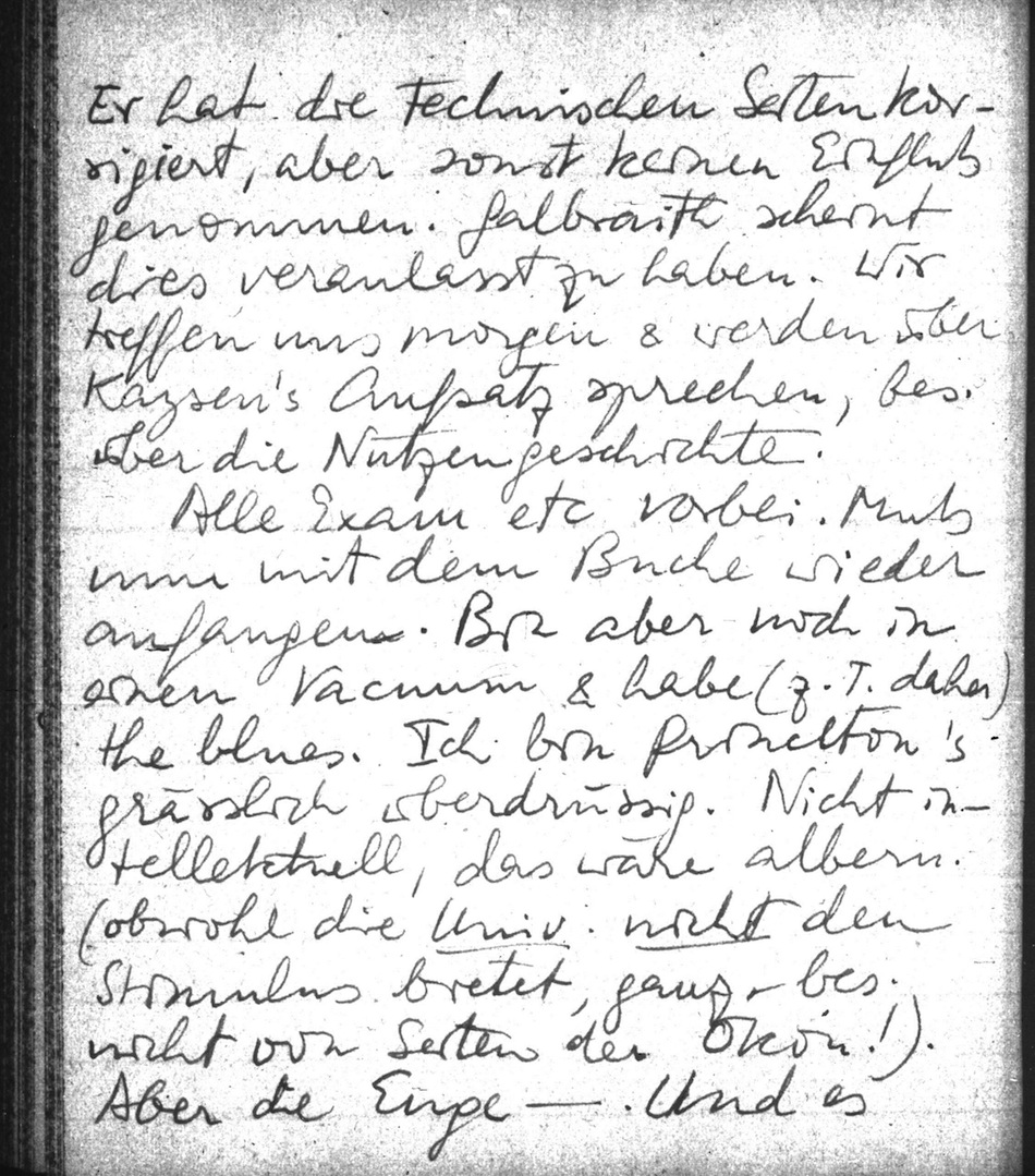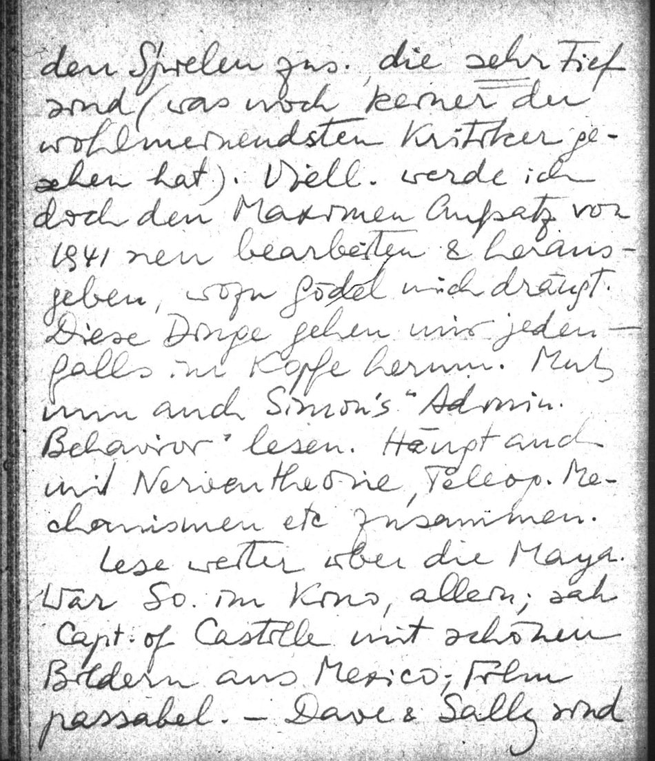 Alle Exam etc vorbei. Muß nun mit dem Buche wieder anfangen. Bin aber noch in einen Vacuum & habe (z.T. daher) the blues. Ich bin Princeton's grässlich überdrüssig. Nicht intellektuell, das wäre albern. (obwohl die Univ. nicht den Stimulus bietet, ganz bes. nicht von Seiten der Ökon!). Aber die Enge . Und es fehlt mir, wohl mehr als alles andere, intimer weiblicher Kontakt im Sinne echter Gesellschaft & wirklichen Interesses. Ich vermisse Winnie und andere & kann nur mit tief betrübtem Herzen an andere denken. Woher soll eine neue Anregung kommen, in dieser Monotonie & Fesselung an das Papier?! Dabei möchte ich gleichzeitig wieder Ruhe haben, um die 100e Dinge denken zu können, die mir im Kopfe herum gehen. In letzter Zeit viel über Organisationen, Wirksamkeit, Effekt, Autorität etc nachgedacht. Hängt fundamental natürlich mit den Spielen zus., die sehr tief sind (was noch keiner der wohlmeinendsten Kritiker gesehen hat). Viell. werde ich doch den Maximen Aufsatz von 1941 neu bearbeiten & herausgeben, wozu Gödel mich drängt. Diese Dinge gehen mir jedenfalls im Kopfe herum. Muß nun auch Simon's "Admin. Behavior" lesen. Hängt auch mit Nerventheorie, Teleog. Mechanismen etc zusammen.