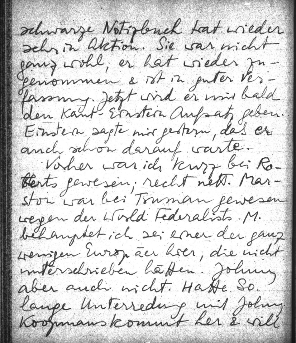 Bei Gödels sehr nett. Das kleine schwarze Notizbuch trat wieder sehr in Aktion. Sie war nicht ganz wohl; er hat wieder zugenommen & ist in guter Verfassung. Jetzt wird er mir bald den Kant-Einstein Aufsatz geben. Einstein sagte mir gestern, daß er auch schon darauf warte.