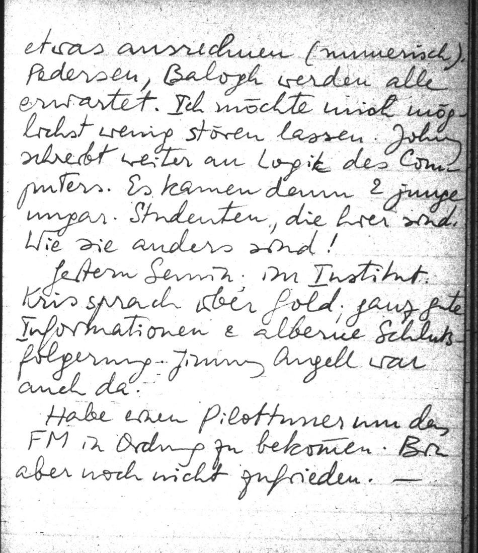 Vorher war ich kurz bei Roberts gewesen; recht nett. Marston war bei Truman gewesen wegen der World Federalists. M. behauptet ich sei einer der ganz wenigen Europäer hier, die nicht unterschrieben hätten. Johnny aber auch nicht. Hatte So. lange Unterredung mit Johnny. Koopmans kommt her & will etwas ausrechnen (numerisch). Pedersen Balogh werden alle erwartet. Ich möchte mich möglichst wenig stören lassen. Johnny schreibt weiter an Logik des Computers. Es kamen dann 2 junge ungar. Studenten, die hier sind. Wie sie anders sind!
