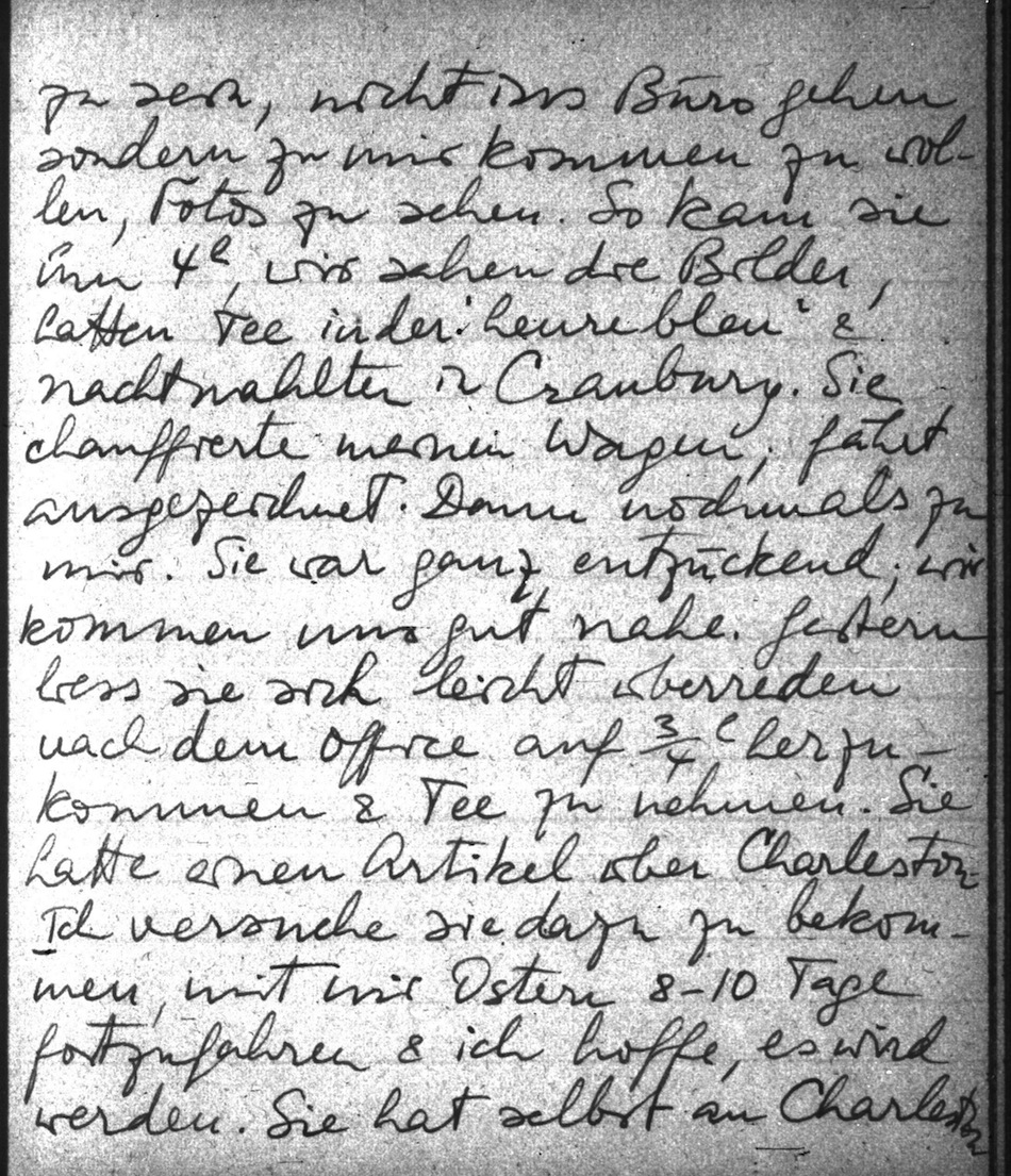 Do. Lunch mit Dorothy bei Lahière. Sie sah reizend aus, erklärte müde zu sein, nicht ins Büro gehen sondern zu mir kommen zu wollen, Fotos zu sehen. So kam sie um 4h, wir sahen die Bilder, hatten Tee in der "heure bleu" & nachtmahlten in Cranbury. Sie chauffierte meinen Wagen; fährt ausgezeichnet. Dann nochmals zu mir. Sie war ganz entzückend; wir kommen uns gut nahe. Gestern liess sie sich leicht überreden nach dem Office auf ¾h herzukommen & Tee zu nehmen. Sie hatten einen Artikel über Charleston. Ich versuche sie dazu zu bekommen, mit mir Ostern 8-10 Tage fortzufahren & ich hoffe, es wird werden. Sie hat selbst an Charleston gedacht & obwohl sie sich sträubt, wird man sehen. Wir wollen nächstes Weekend irgendetwas tun, viell. N.Y. Sie ist noch etwas scheu, aber sehr freundlich & zärtlich. Mich freut das alles über alle Maassen; es gibt mir einen enormen Auftrieb & die Welt schaut wieder viel besser aus (was sie notwendig hat).
