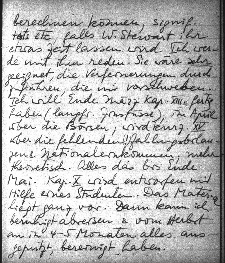 Tüchtig mit der Arbeit vorwärts gekommen. Miss Brubauer (?) hat einen MA in Math. Stat. von Wald war hier; wird etliches berechnen können, signif. tests etc, falls W. Stewart ihr etwas Zeit lassen wird. Ich werde mit ihm reden. Sie wäre sehr geeignet, die Verfeinerungen durchzuführen, die mir vorschweben. Ich will Ende März Kap. XIII. fertig haben (langfr. Zinsfüsse); im April über die Börsen; wird kurz. XV über die fehlenden (!) Zahlungsbilanzen & Nationaleinkommen; mehr theoretisch. Alles das bis Ende Mai. Kap. X wird entworfen mit Hilfe eines Studenten. Das Material liegt ganz vor. Dann kann ich beruhigt abreisen & vom Herbst an in 4-5 Monaten alles ausgeputzt, bereinigt haben.