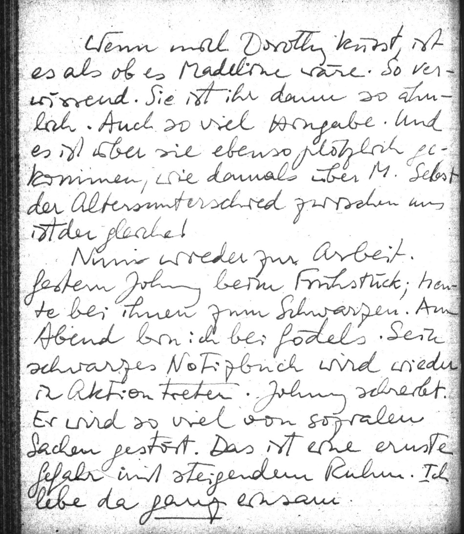Nun wieder zur Arbeit. Gestern Johnny beim Frühstück; heute bei ihnen zum Schwarzen. Am Abend bin ich bei Gödels. Sein schwarzes Notizbuch wird wieder in Aktion treten. Johnny schreibt. Er wird so viel von sozialen Sachen gestört. Das ist eine ernste Gefahr mit steigendem Ruhm. Ich lebe da ganz einsam.