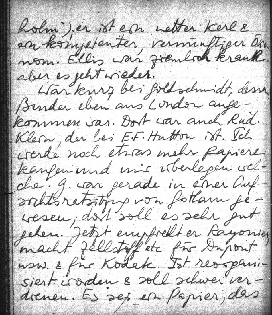 War kurz bei Goldschmidt, dessen Bruder eben aus London gekommen war. Dort war auch Rud. Klein, der bei E. F. Hutton ist. Ich werde noch etwas mehr Papiere kaufen und mir überlegen welche. G. war gerade in einer Aufsichtsratsitzung von Gotham gewesen; dort soll es sehr gut gehen. Jetzt empfiehlt er Rayonier, macht Zellstoff etc. für Dupont usw. & für Kodak. Ist reorganisiert worden & soll schwer verdienen. Es sei ein Papier, das man 2-3 Jahre liegen lassen soll.