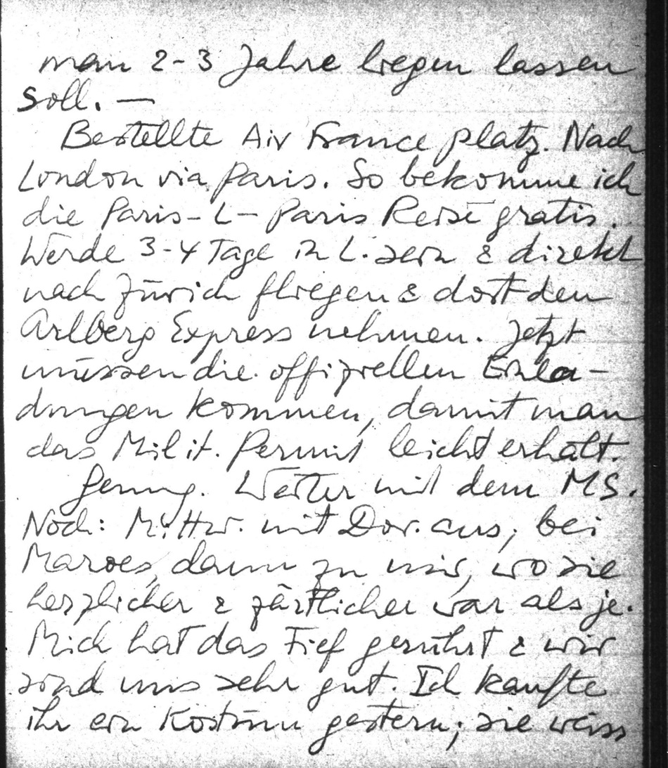 Bestelle Air France Platz. Nach London via Paris. So bekomme ich die Paris-L-Paris Reise gratis. Werde 3-4 Tage in L. sein & direkt nach Zürich fliegen & dort den Arlberg Express nehmen. Jetzt müssen die offiziellen Einladungen kommen, damit man das Milit. Permit leicht erhält.
