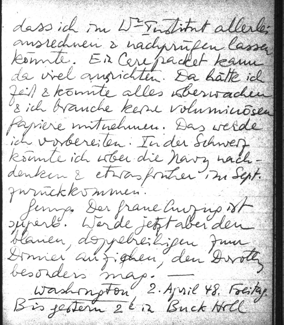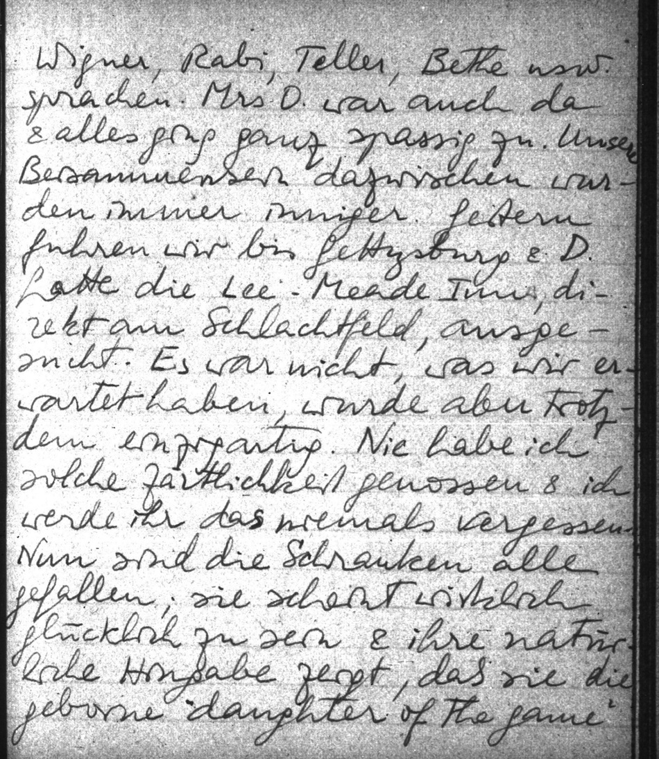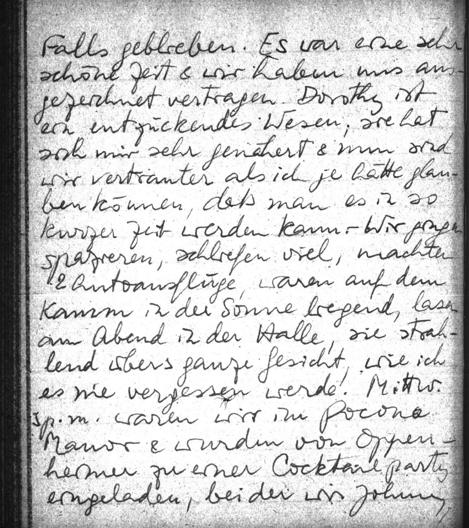 Bis gestern 2h in Buck Hill Falls geblieben. Es war eine sehr schöne Zeit & wir haben uns ausgezeichnet vertragen. Dorothy ist ein entzückendes Wesen; sie hat sich mir sehr genähert & nun sind wir vertrauter als ich je hätte glauben können, daß man es in so kurzer Zeit werden kann. Wir gingen spazieren, schliefen viel, machten 2 Autoausflüge, waren auf dem Kamm in der Sonne liegend, lasen am Abend in der Halle, sie strahlend übers ganze Gesicht, wie ich es nie vergessen werde. Mittw. 5 p.m. waren wir im Pocona Manor zu einer Cocktail party eingeladen, bei der wir Johnny, Wigner, Rabi, Teller, Bethe usw. sprachen. Mrs. O. war auch da & alles ging ganz spassig zu. Unsere Beisammensein dazwischen wurden immer inniger. Gestern fuhren wir bis Gettysburg & D. hatte die Lee-Meade Inn, direkt am Schlachtfeld, ausgesucht. Es war nicht, was wir erwartet haben, wurde aber trotzdem einzigartig. Nie habe ich solche Zärtlichkeit genossen & ich werde ihr das niemals vergessen. Nun sind die Schranken alle gefallen; sie scheint wirklich glücklich zu sein & ihre natürliche Hingabe zeigt, daß sie die geborene "daughter of the game" ist. Nun sehe ich erst, was ich in vieler Hinsicht für ein armes Leben geführt habe. Dass mir dies noch beschert wurde, ist ein grosses Glück & was immer werden möge, ich bin um unauslöschliche Erfahrung bereichert. Ich glaube, ich habe es ihr leicht gemacht.