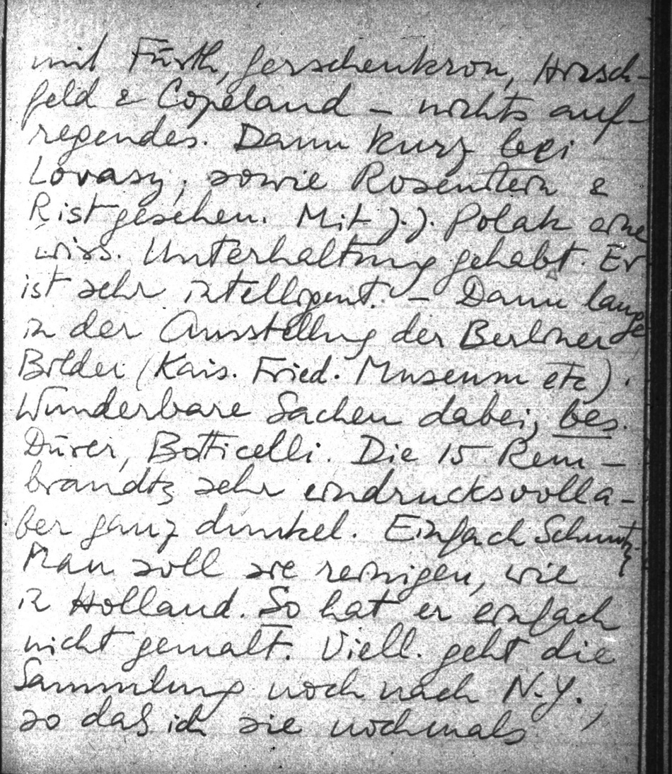 Mittagessen im Fed. Res. Bd, mit Fürth, Gerschenkron, Hirschfeld & Copeland nichts aufregendes. Dann kurz bei Lovasy; sowie Rosenstein & Rist gesehen. Mit J.J. Polak eine wiss. Unterhaltung gehabt. Er ist sehr intelligent. Dann lange in der Ausstellung der Berliner Bilder (Kais. Fried. Museum etc). Wunderbare Sachen dabei, bes. Dürer, Botticelli. Die 15 Rembrandts sehr eindrucksvoll aber ganz dunkel. Einfach Schmutz. Man soll sie reinigen, wie in Holland. So hat er einfach nicht gemalt. Viell. geht die Sammlung noch nach N.Y., so daß ich sie nochmals sehen kann. Man wird die Bilder viell. nie wieder zu Gesicht bekommen.