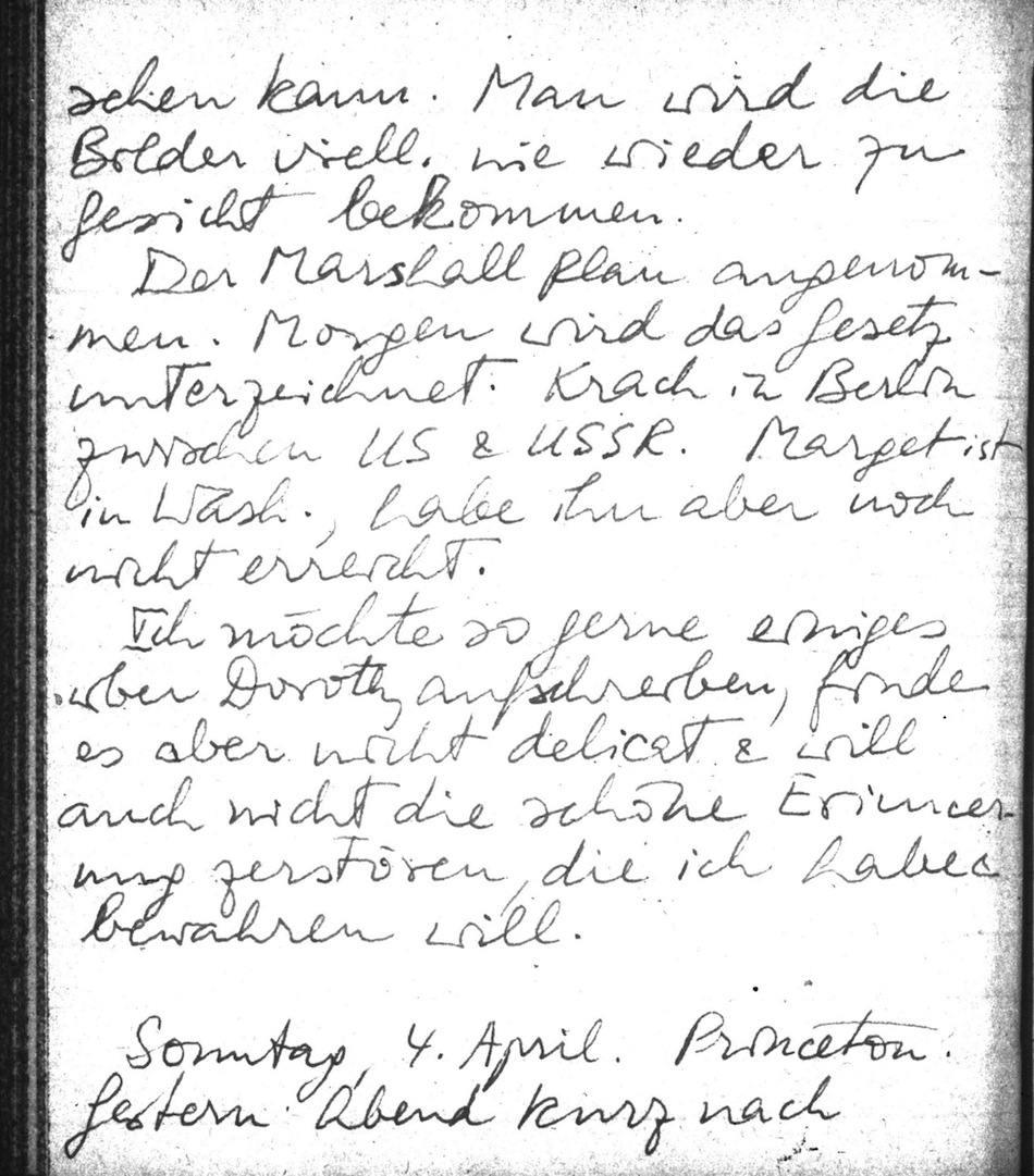 Der Marshall Plan angenommen. Morgen wird das Gesetz unterzeichnet. Krach in Berlin zwischen US & USSR. Marget ist in Wash., habe ihn aber noch nicht erreicht.