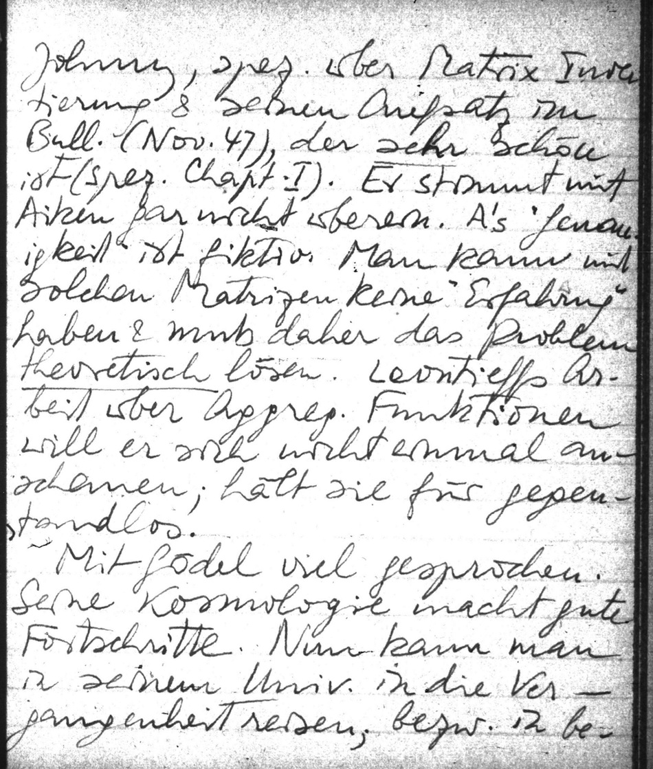 Viele Besprechungen mit Johnny, spez. über Matrix Invertierung & seinen Aufsatz im Bull. (Nov. 47), der sehr schön ist (spez. Chapt. I). Er stimmt mit Aiken gar nicht überein. A's "Genauigkeit" ist fiktiv. Man kann mit solchen Matrizen keine "Erfahrung" haben & muß daher das Problem theoretisch lösen. Leontieffs Arbeit über Aggreg. Funktionen will er sich nicht einmal anschauen; hält sie für gegenstandslos.