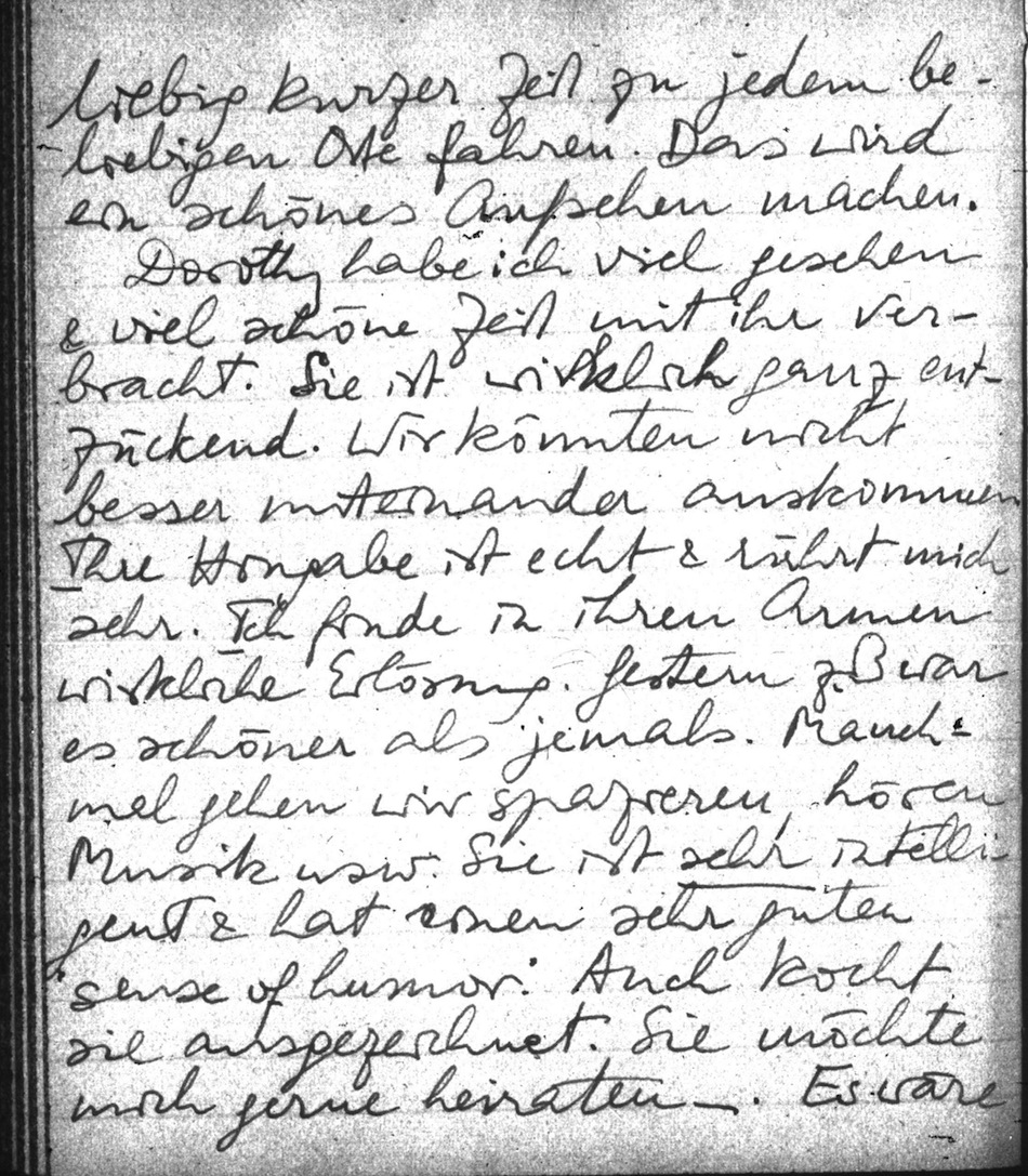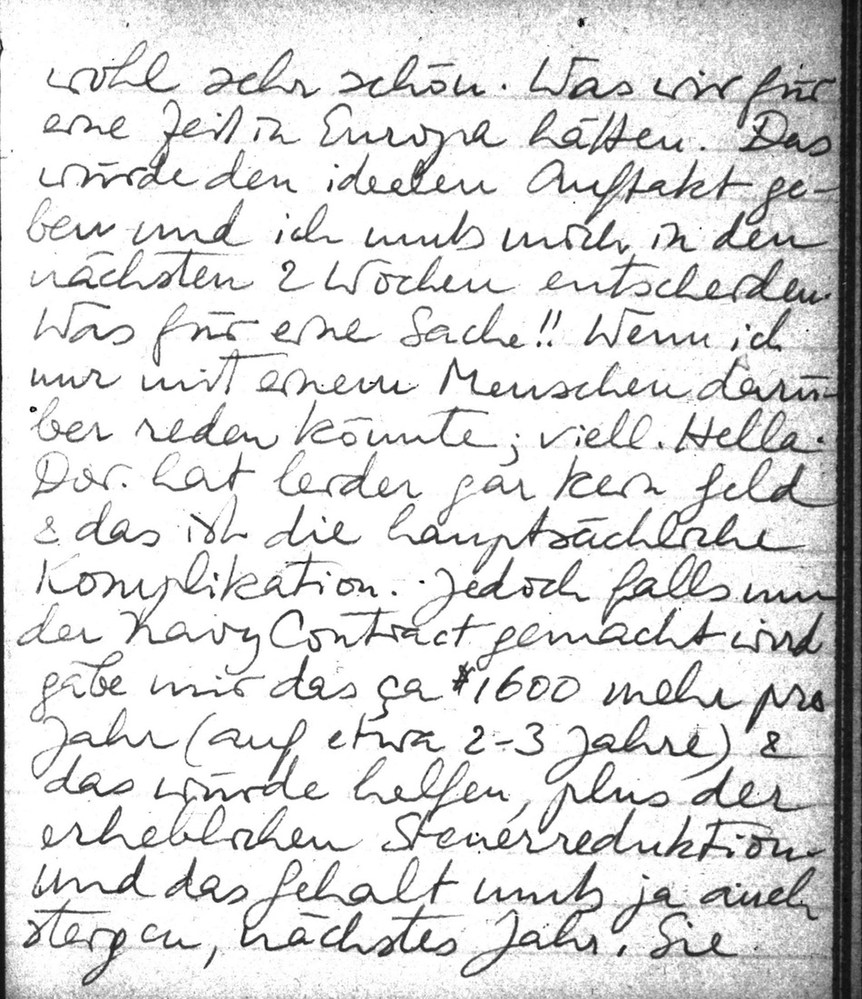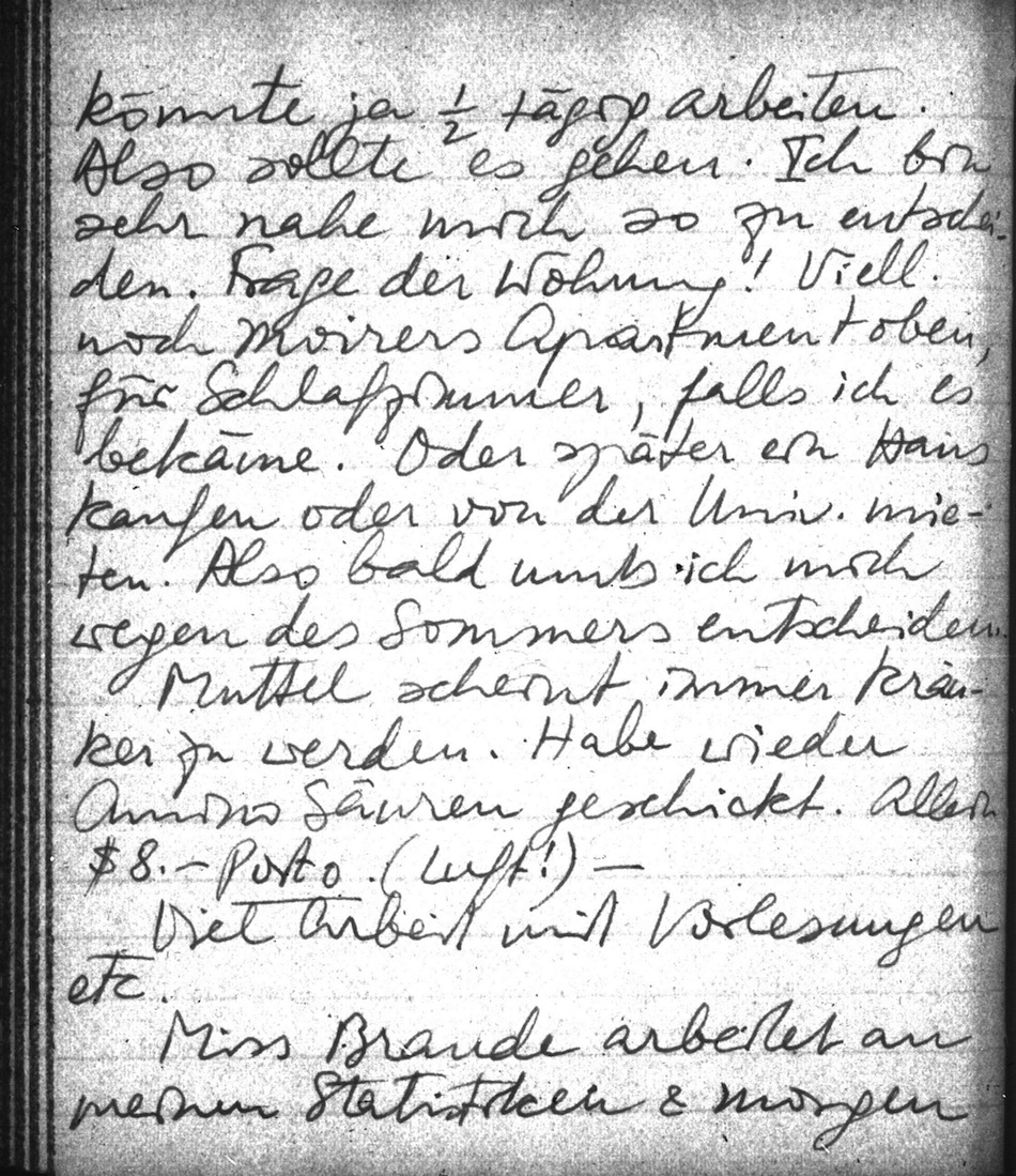Dorothy habe ich viel gesehen & viel schöne Zeit mit ihr verbracht. Sie ist wirklich ganz entzückend. Wir könnten nicht besser miteinander auskommen. Ihre Hingabe ist echt & rührt mich sehr. Ich finde in ihren Armen wirkliche Erlösung. Gestern z.B. war es schöner als jemals. Manchmal gehen wir spazieren, hören Musik usw. Sie ist sehr intelligent & hat einen sehr guten "sense of humor". Auch kocht sie ausgezeichnet. Sie möchte mich gerne heiraten. Es wäre wohl sehr schön. Was wir für eine Zeit in Europa hätten. Das würde den idealen Auftakt geben und ich muß mich in den nächsten 2 Wochen entscheiden. Was für eine Sache!! Wenn ich nur mit einem Menschen darüber reden könnte; viell. Hella. Dor. hat leider gar kein Geld & das ist die hauptsächliche Komplikation. Jedoch falls nun der Navy Contract gemacht wird gäbe mir das ça $ 1600 mehr pro Jahr (auf etwa 2-3 Jahre) & das würde helfen, plus der erheblichen Steuerreduktion. Und das Gehalt muß ja auch steigen, nächstes Jahr. Sie könnte ja ½ tägig arbeiten. Also sollte es gehen. Ich bin sehr nahe mich so zu entscheiden. Frage der Wohnung! Viell. noch Moirers Apartment oben, für Schlafzimmer, falls ich es bekäme. Oder später ein Haus kaufen oder von der Univ. mieten. Also bald muß ich mich wegen des Sommers entscheiden.