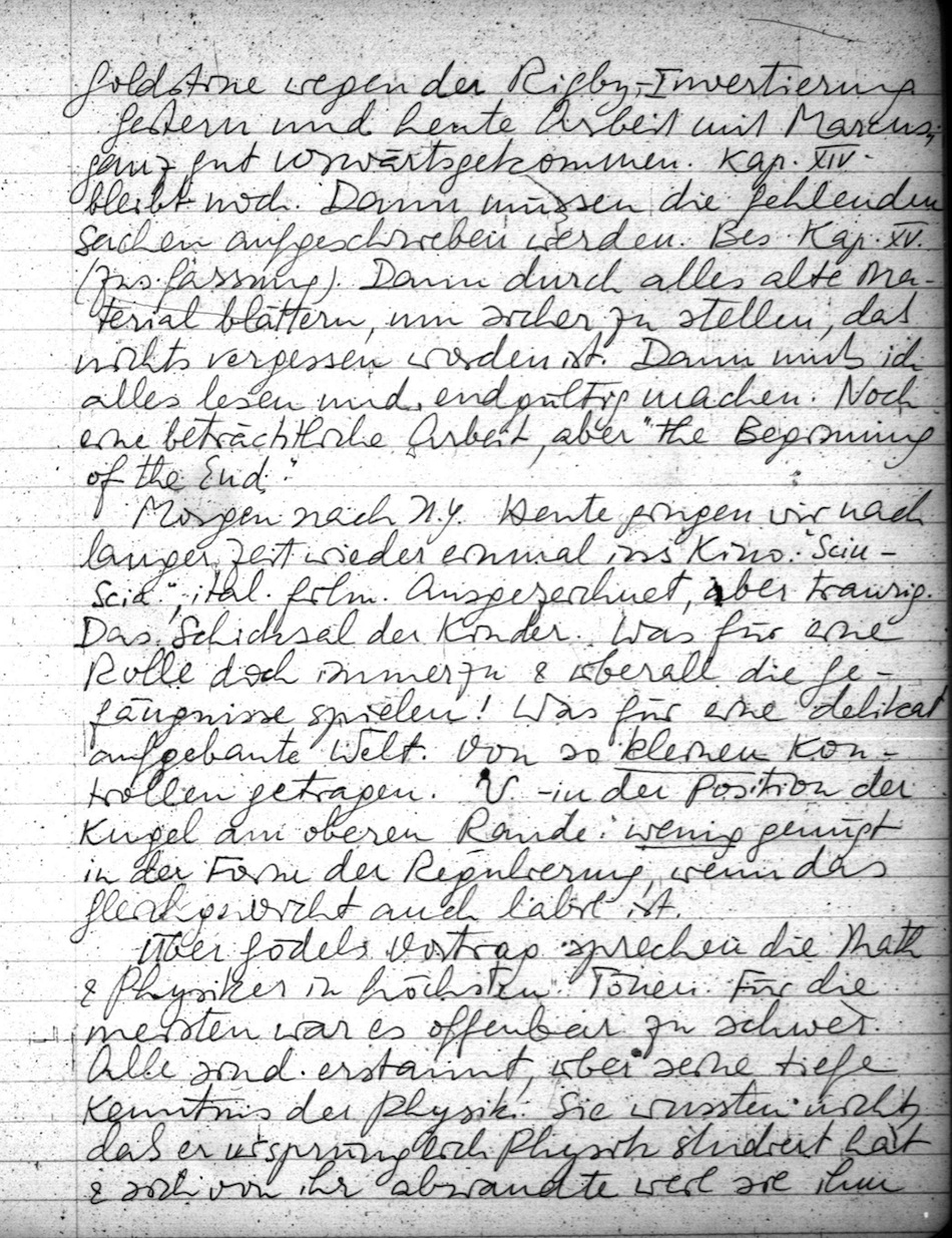 Gestern und heute Arbeit mit Marcus; ganz gut vorwärtsgekommen. Kap. XIV bleibt noch. Dann müssen die fehlenden Sachen aufgeschrieben werden. Bes. Kap. XV (Zus.fassung). Dann durch alles alte Material blättern, um sicher zu stellen, daß nichts vergessen worden ist. Dann muß ich alles lesen und endgültig machen. Noch eine beträchtliche Arbeit, aber "the Beginning of the End."