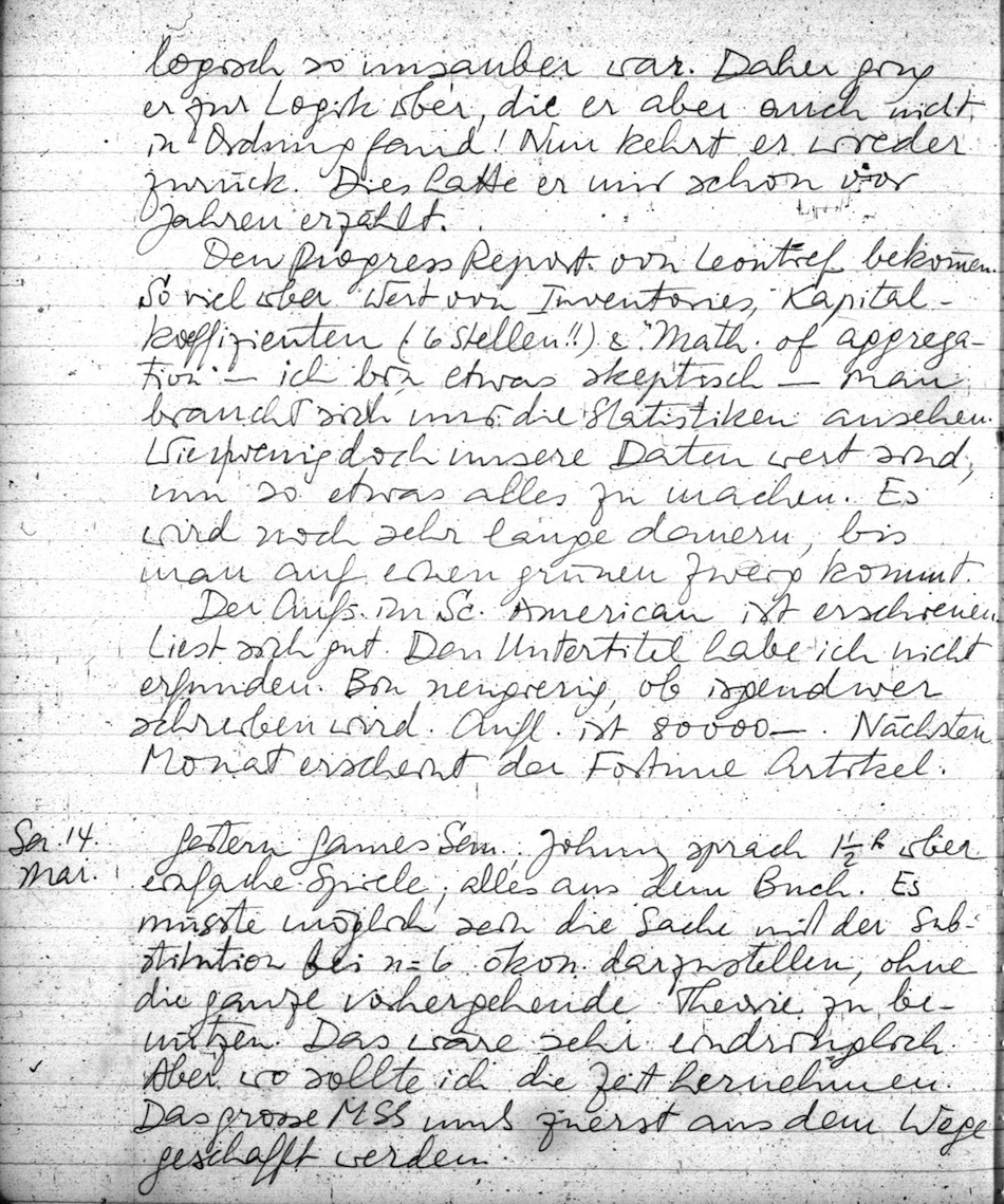 Den Progress Report von Leontief bekommen. So viel über Wert von Inventories, Kapitalkoeffizienten (6 Stellen!!) & "Math. of aggregation" ich bin etwas skeptisch Man braucht sich nur die Statistiken ansehen. Wie wenig doch unsere Daten wert sind, um so etwas alles zu machen. Es wird noch sehr lange dauern, bis man auf einen grünen Zweig kommt.