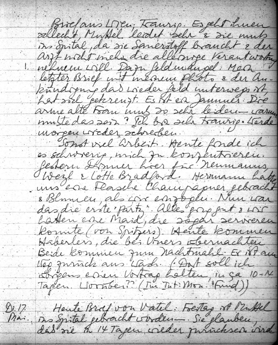 Heute Brief von Vatel: Freitag ist Muttel ins Spital gebracht worden . Sie glauben, daß sie in 14 Tagen wieder zurücksein wird. Ich zweifle sehr. Sie ist bei Eiselsberg. Dazu kommt, daß sie kein Geld mehr haben. Es scheint alles sehr traurig zu sein. Geld ist wieder unterwegs. Was für ein Jammer, daß gerade Muttel so leiden muß. Es ist ganz unmöglich von hier aus mehr zu tun. Wie grässlich, sich sagen zu müssen, daß sie erlöst werden möge; sie muß nun auch Sauerstoff bekommen & hat schmerzhafte Anfälle von Angina Pectoris. Die arme Hannchen.