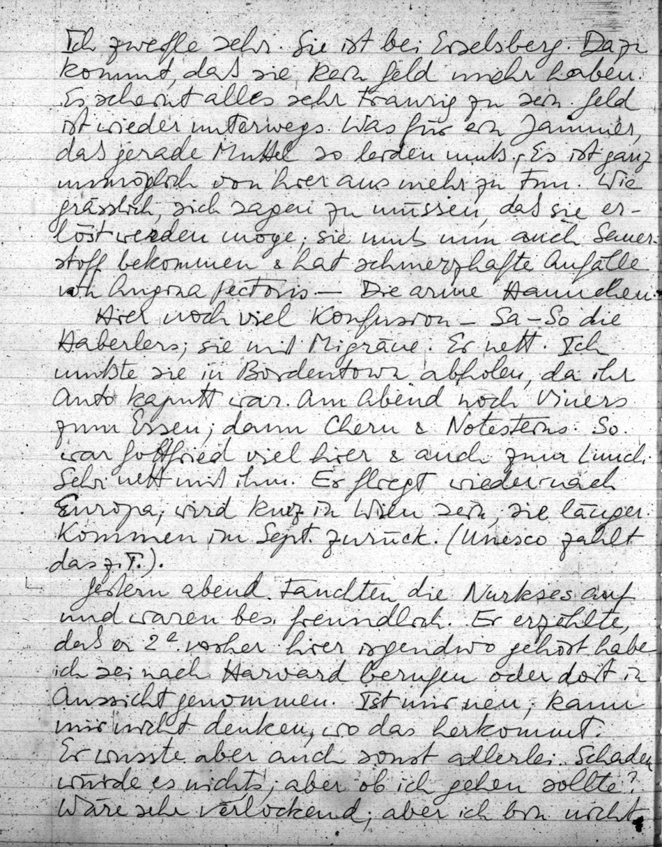 Gestern abend tauchten die Nurkses auf und waren bes. freundlich. Er erzählte, daß er 2h vorher hier irgendwo gehört habe ich sei nach Harvard berufen oder dort in Aussicht genommen. Ist mir neu; kann mir nicht denken, wo das herkommt. Er wusste aber auch sonst allerlei. Schaden würde es nichts; aber ob ich gehen sollte? Wäre sehr verlockend; aber ich bin nicht a priori dafür & Dorothy auch nicht.