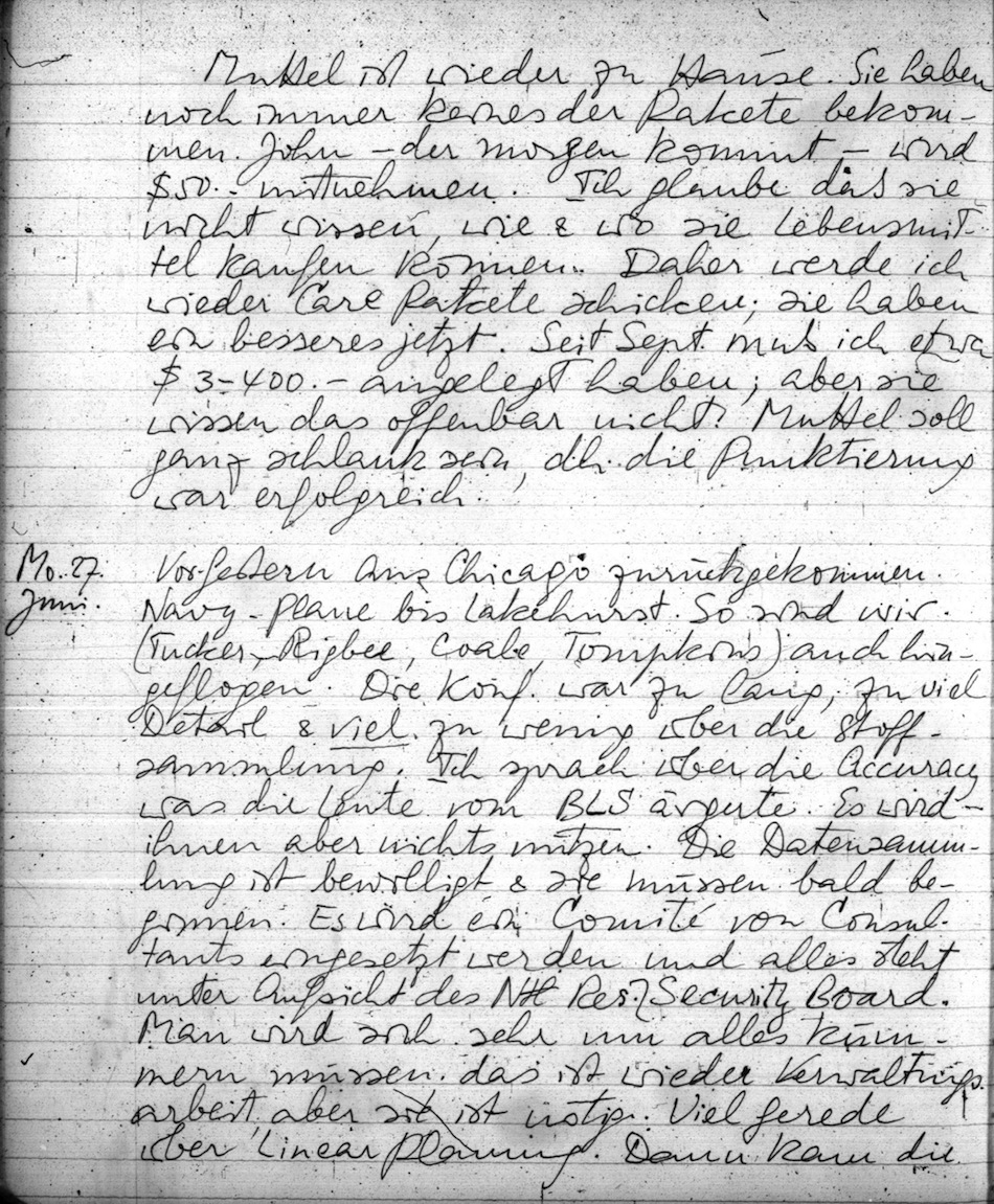Vor-gestern aus Chicago zurückgekommen. Navy-Plane bis Lakehurst. So sind wir (Tucker, Rigby, Coale, Tompkins) auch hingeflogen. Die Konf. war zu lang, zu viel Detail & viel zu wenig über die Stoffsammlung. Ich sprach über die Accuracy was die Leute vom BLS ärgerte. Es wird ihnen aber nichts nützen. Die Datensammlung ist bewilligt & sie müssen bald beginnen. Es wird ein Comité von Consultants eingesetzt werden und alles steht unter Aufsicht des Ntl Res. Security Board. Man wird sich sehr um alles kümmern müssen; das ist wieder Verwaltungsarbeit, aber sie ist nötig. Viel Gerede über Linear Planning. Dann kam die Konvexität auf. Tucker sprach über Weyls Satz von 1935. Koopmans konnte die Allgemeinheit nicht sehen; sehr merkwürdig. Samuelson meinte der MinMax Satz sei ganz einfach intuitiv. Aber Tucker sagte, richtig, daß es ein ganz tiefer Satz sei. Johnny hätte sich gefreut! Tucker & Rigby hatten keinen guten Eindruck von S. Er ist aber dennoch recht gut & den meisten Ökonomen turmhoch überlegen. Woodbury machte sich ganz gut; kommt diese Woche. Whitin war sehen, aber sehr aufmerksam & kritisch. Er wird sich entwickeln, bes. wenn er Algebra etc studiert, was er tun muß (und ich auch!). Rigby stimmt Johnny zu, der vor einiger Zeit Mina Rees gesagt hat es werde 10 Jahre dauern ehe man hier wirklich Fortschritte machen werde.