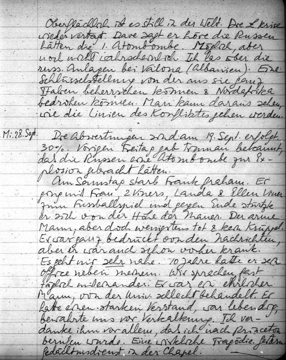 Am Samstag starb Frank Graham. Er ging mit Frau, 2 Viners, Lauda & Ellen Viner zum Fussballspiel und gegen Ende stürzte er sich von der Höhe der Mauer. Der arme Mann; aber doch wenigstens tot & kein Krüppel. Er war ganz bedrückt von den Nachrichten, aber er war auch schon vorher krank. Es geht mir sehr nahe. 10 Jahre hatte er sein Office neben meinem. Wir sprachen fast täglich miteinander. Er war ein ehrlicher Mann, von der Univ. schlecht behandelt. Er hatte einen starken Verstand, war lebendig, bewahrte uns vor Verkalkung. Ich verdanke ihm vor allem, daß ich nach Princeton berufen wurde. Eine wirkliche Tragödie. Gestern Gedächtnisdienst in der Chapel.
