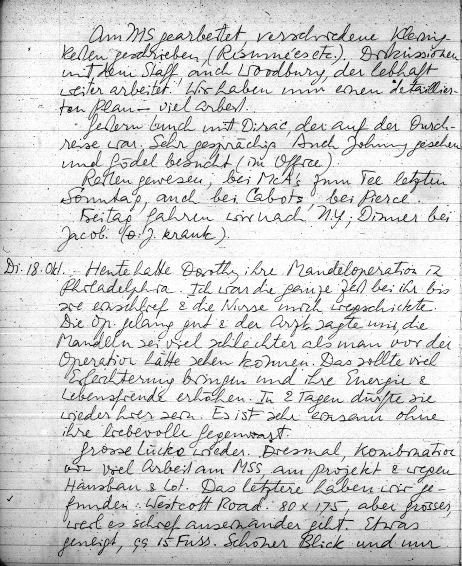 Gestern Lunch mit Dirac, der auf der Durchreise war. Sehr gesprächig. Auch Johnny gesehen und Gödel besucht (im Office).