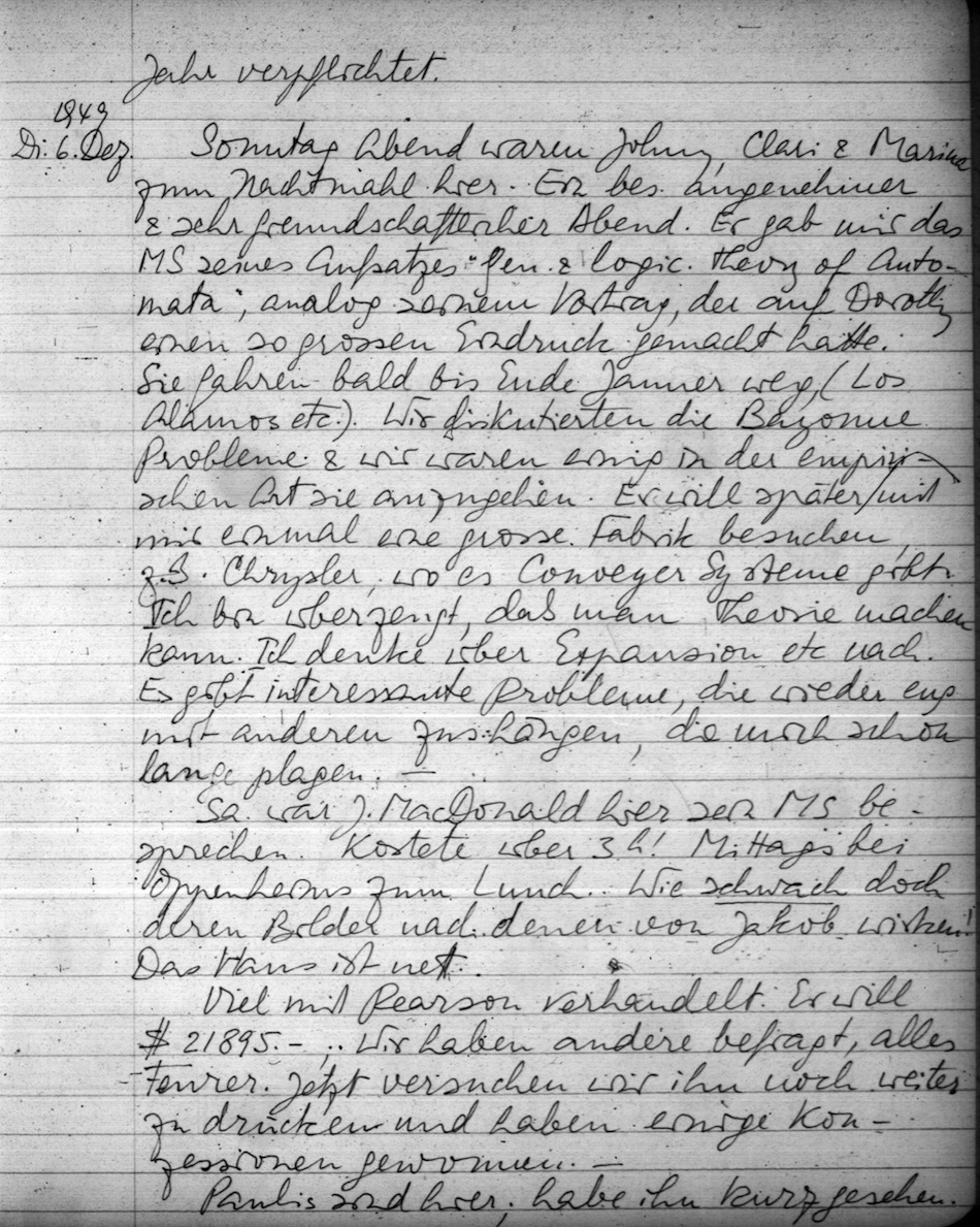 Sonntag Abend waren Johnny, Clari & Marina zum Nachtmahl hier. Ein bes. angenehmer & sehr freundschaftlicher Abend Er gab mir das MS seines Aufsatzes "Gen. & logic. theory of Automata", analog seinem Vortrag, der Auf Dorothy einen so grossen Eindruck gemacht hatte. Sie fahren bald bis Ende Jänner weg (Los Alamos etc.) Wir diskutierten die Bayonne Probleme & wir waren einig in der empirischen Art sie anzugehen. Er will später mit mir einmal eine grosse Fabrik besuchen, z.B. Chrysler, wo es Conveyer Systeme gibt. Ich bin überzeugt, daß man Theorie machen kann. Ich denke über Expansion etc. nach. Es gibt interessante Probleme, die wieder eng mit anderen zus.hängen, die mich schon lange plagen.