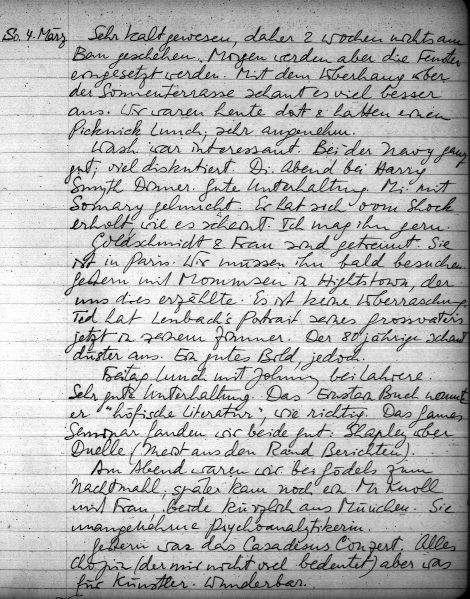 Goldschmidt & Frau sind getrennt. Sie ist in Paris. Wir müssen ihn bald besuchen. Gestern mit Mommsen in Hightstown, der uns dies erzählte. Es ist keine Überraschung. Ted hat Lenbach's Portrait seines Grossvaters jetzt in seinem Zimmer. Der 80jährige schaut düster aus. Ein gutes Bild, jedoch.