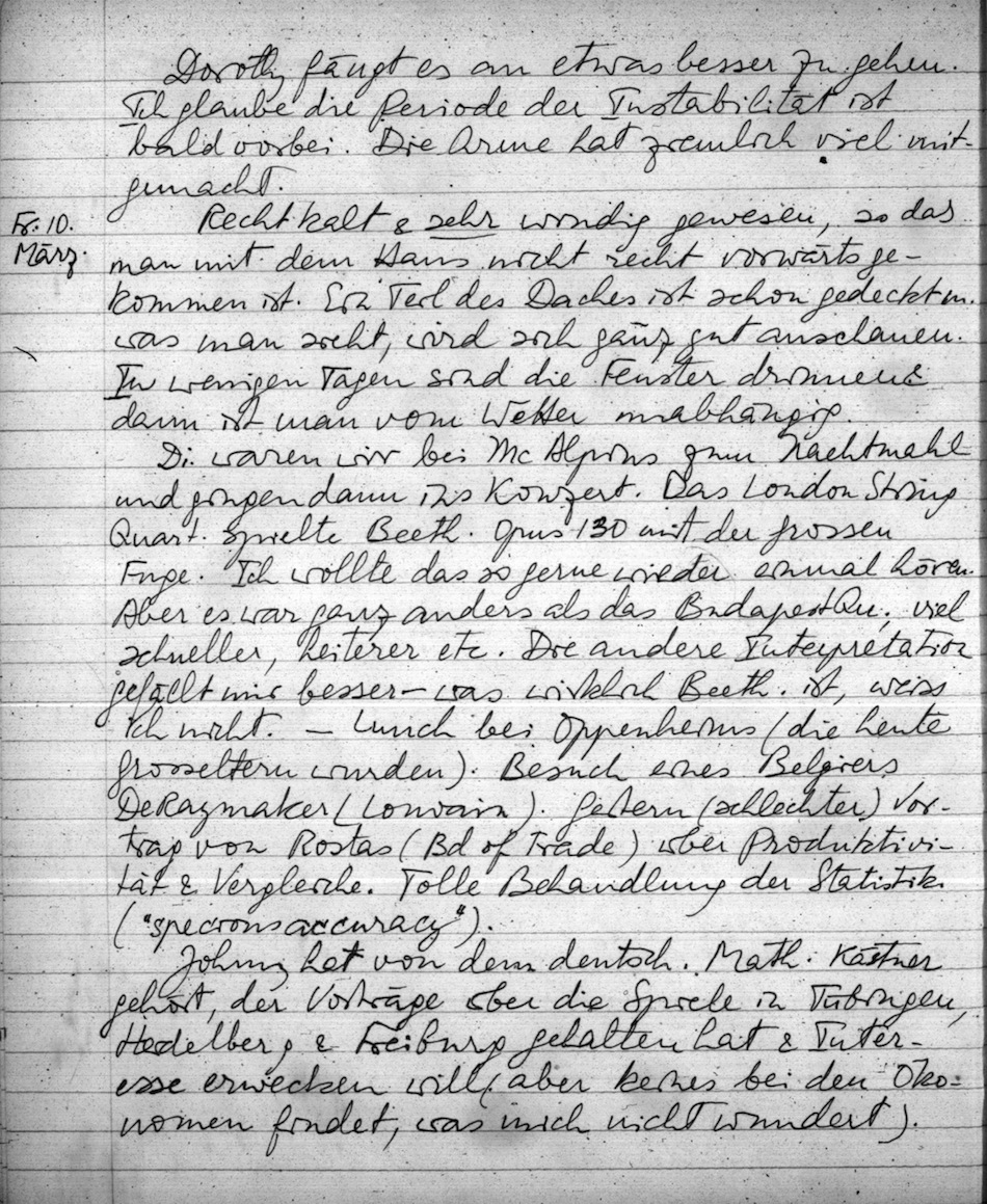 Wash. war interessant. Bei der Navy ganz gut; viel diskutiert. Di. Abend bei Harry Smyth Dinner. Gute Unterhaltung. Mi. mit Somary geluncht. Er hat sich vom Schock erholt, wie es scheint. Ich mag ihn gern.