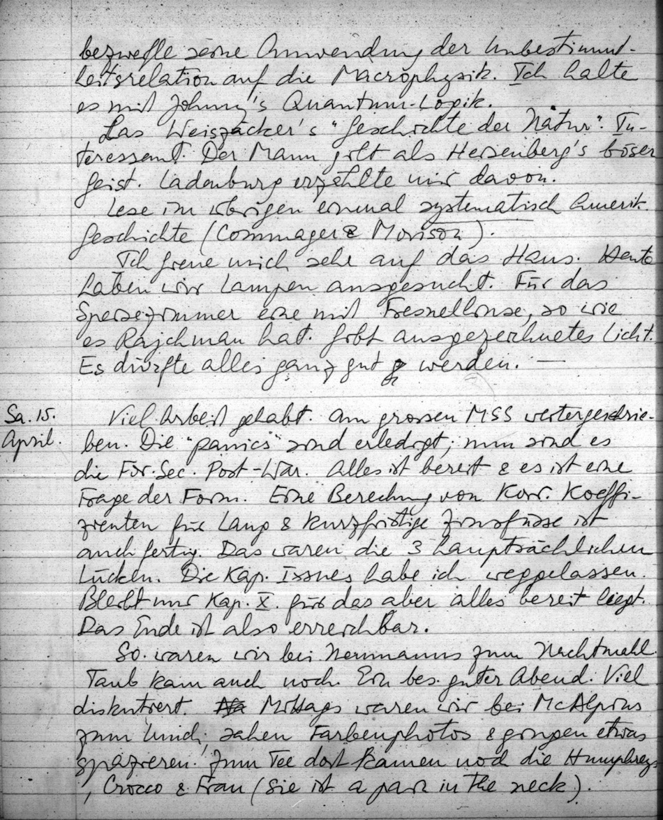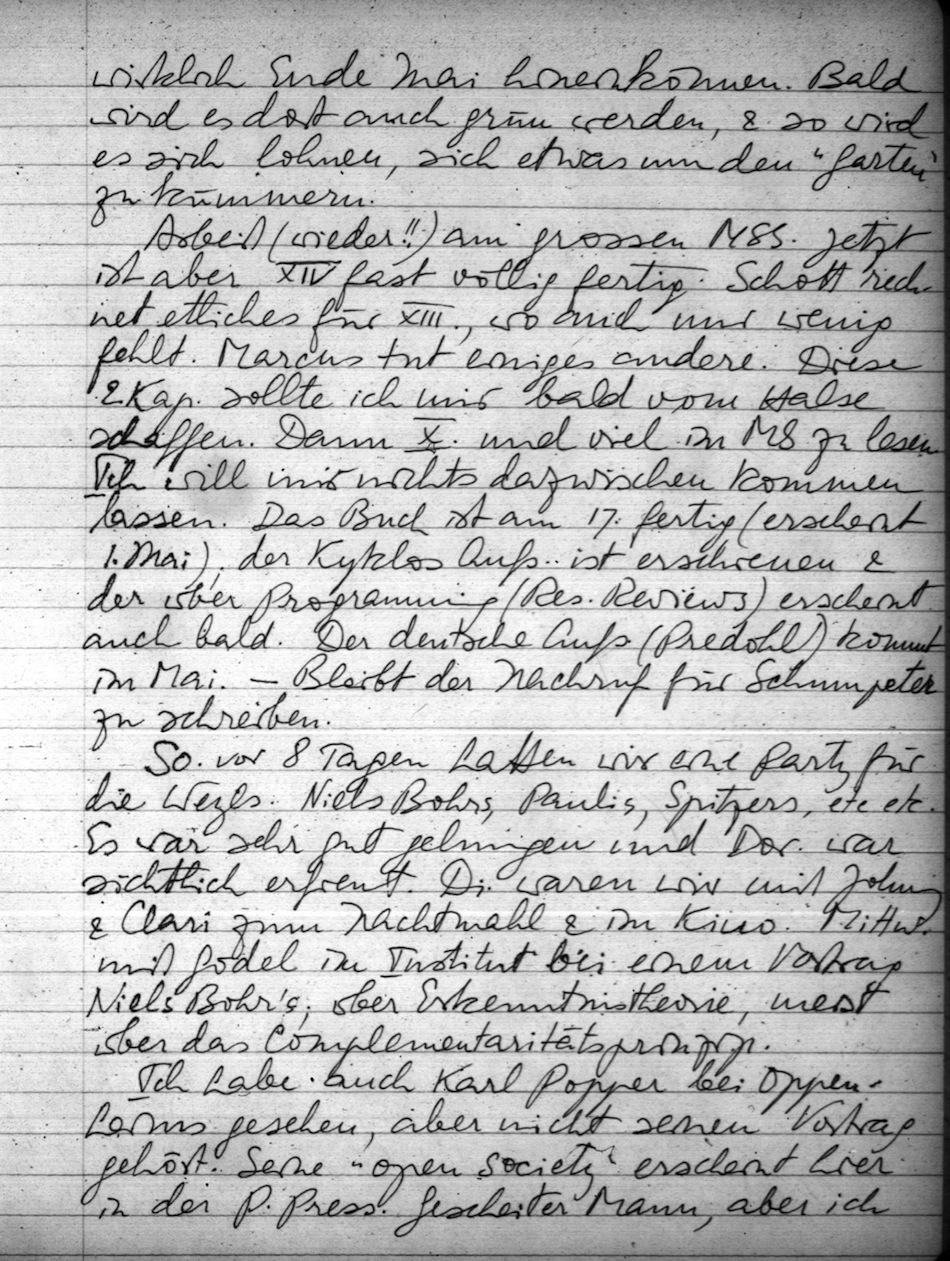 So. vor 8 Tagen hatten wir eine Party für die Weyls. Niels Bohrs, Paulis, Spitzers, etc. etc. Es war sehr gut gelungen und Dor. war sichtlich erfreut. Di. waren wir mit Johnny & Clari zum Nachtmahl & im Kino. Mittw. mit Gödel im Institut bei einem Vortrag Niels Bohr's; über Erkenntnistheorie, meist über das Complementaritätsprinzip.