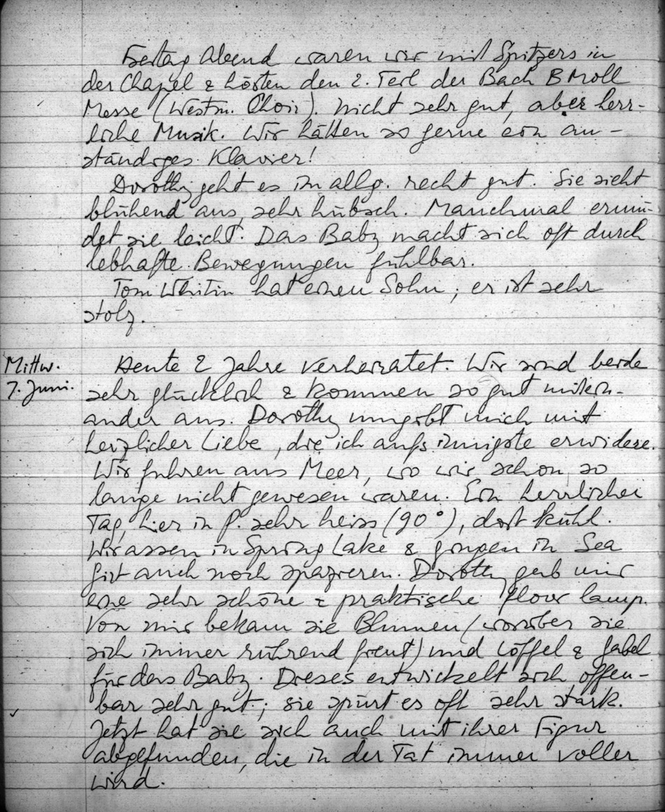 Heute 2 Jahre verheiratet. Wir sind beide sehr glücklich & kommen so gut miteinander aus. Dorothy umgibt mich mit herzlicher Liebe, die ich aufs innigste erwidere. Wir fuhren ans Meer, wo wir schon so lange nicht gewesen waren. Ein herrlicher Tag, hier in P. sehr heiss (90°), dort kühl. Wir assen in Spring Lake & gingen in Sea Girt auch noch spazieren. Dorothy gab mir eine sehr schöne & praktische flow lamp. Von mir bekam sie Blumen (worüber sie sich immer rührend freut) und Löffel & Gabel für das Baby. Dieses entwickelt sich offenbar sehr gut; sie spürt es oft sehr stark. Jetzt hat sie sich auch mit ihrer Figur abgefunden, die in der Tat immer voller wird.