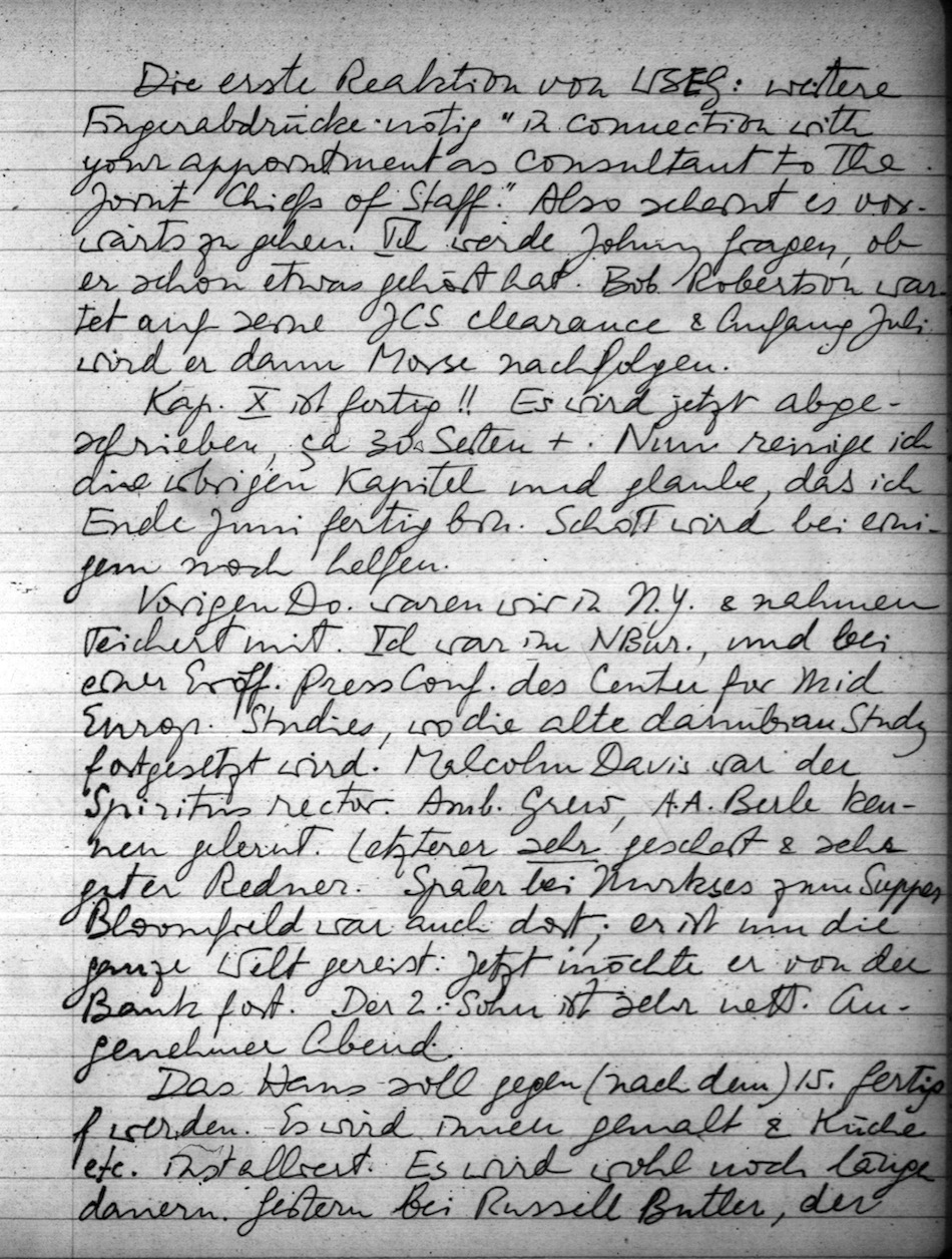 Vorigen Do. waren wir in N.Y. & nahmen Teichert mit. Ich war im NBur., und bei einer Eröff. Press Conf. des Center for Mid Europ. Studies, wo die alte danubian Study fortgesetzt wird. Malcohn Davis war der Spiritus rector. Amb. Grew, A.A. Berle kennen gelernt. Letzterer sehr gescheit & sehr guter Redner. Später bei Nurkses zum Supper. Bloomfield war auch dort; er ist um die ganze Welt gereist. Jetzt möchte er von der Bank fort. Der 2. Sohn ist sehr nett. Angenehmer Abend.