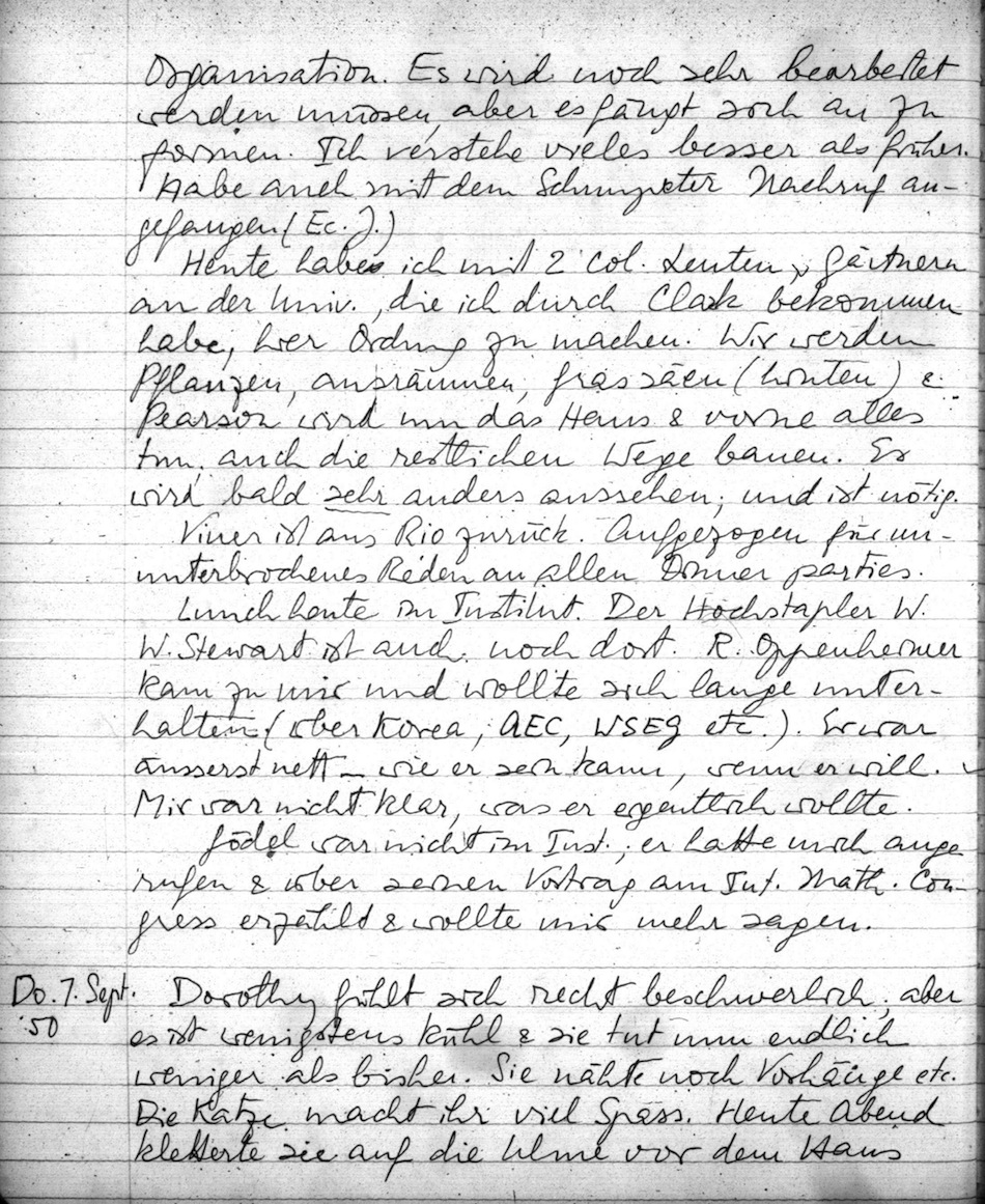 Lunch heute im Institut. Der Hochstapler W. W. Stewart ist auch noch dort. R. Oppenheimer kam zu mir und wollte sich lange unterhalten (über Korea, AEC, WSEG etc.). Er war äusserst nett wie er sein kann, wenn er will. Mir war nicht klar, was er eigentlich wollte.