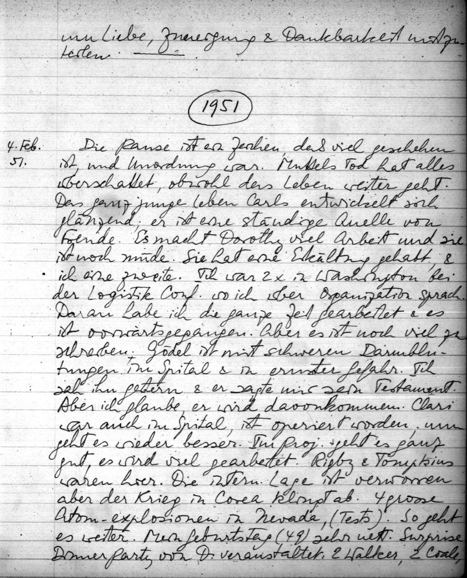 Die Pause ist ein Zeichen, daß viel geschehen ist, und Unordnung war. Muttels Tod hat alles überschattet, obwohl das Leben weiter geht. Das ganz junge Leben Carls entwickelt sich glänzend; er ist eine ständige Quelle von Freude. Er macht Dorothy viel Arbeit und sie ist noch müde. Sie hat eine Erkältung gehabt, & ich eine zweite. Ich war 2 x in Washington bei der Logistik Conf. wo ich über Organization sprach. Daran habe ich die ganze Zeit gearbeitet & es ist vorwärtsgegangen. Aber es ist noch viel zu schreiben; Gödel ist mit schweren Darmblutungen im Spital & in ernster Gefahr. Ich sah ihn gestern & er sagte mir sein Testament. Aber ich glaube, er wird davonkommen. Clari war auch im Spital, ist operiert worden; nun geht es wieder besser. Im Proj. geht es ganz gut, es wird viel gearbeitet. Rigby & Tompkins waren hier. Die intern. Lage ist verworren, aber der Krieg in Corea klingt ab. 4 grosse Atom-explosionen in Nevada (Tests). So geht es weiter. Mein Geburtstag (49) sehr nett. Surprise Dinner Party, von D. veranstaltet: 2 Walker, 2 Coale, 2 Whitin. Am 30. Jän. kauften wir einen 20 Fuß breiten Streifen an der westlichen Seite unseres Grundstückes. Walker kaufte den Rest (70 (50) Fuß) von Morey. Dies bedeutet, daß nichts dort gebaut werden kann. Falls das W. Haus einmal ersetzt wird, könnte man nicht näher als ca. 47 Fuß kommen. Damit haben wir Licht & Sonne auch im Winter gesichert.