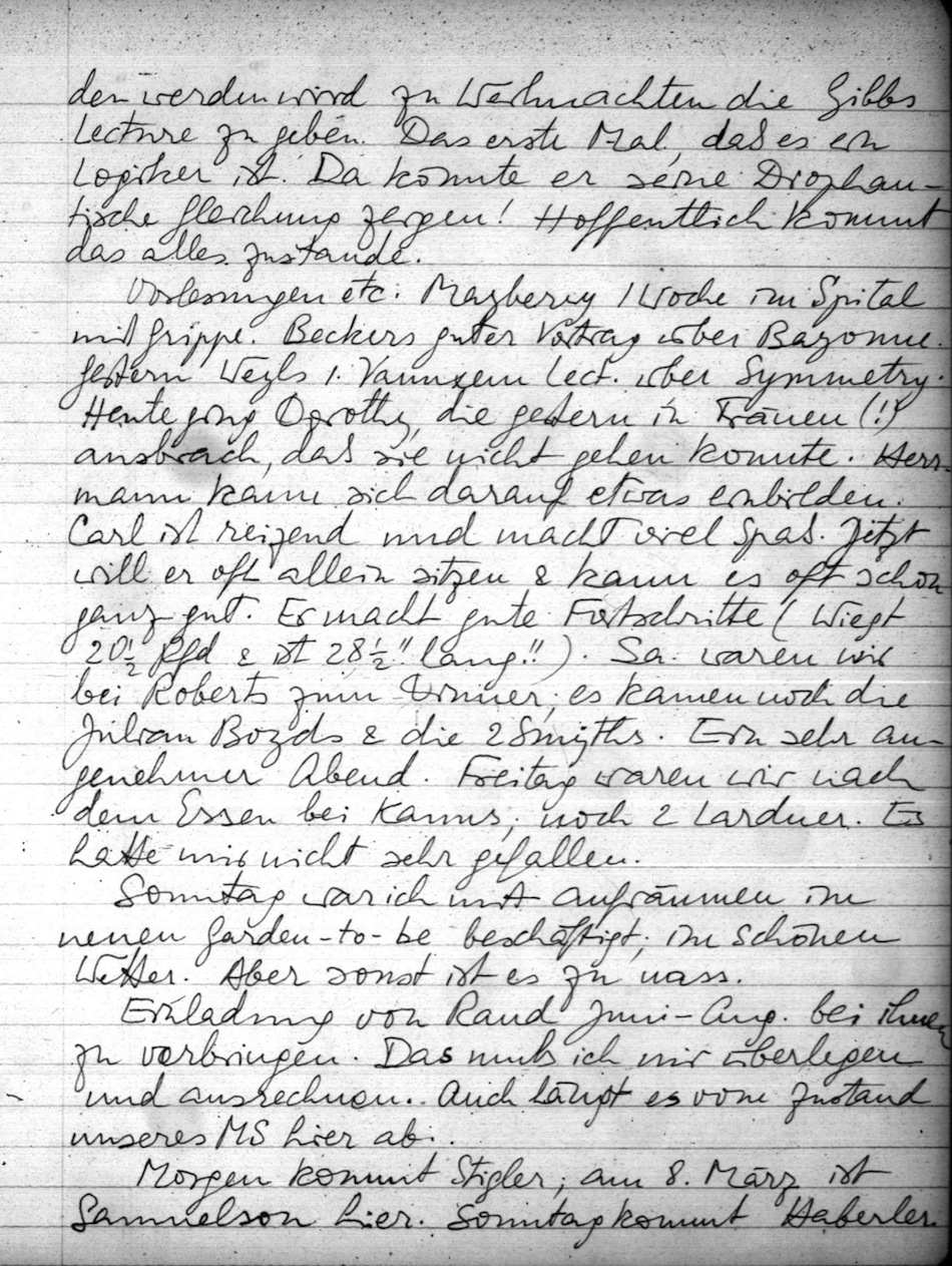 Vorlesungen etc. Mayberry 1 Woche im Spital mit Grippe. Beckers guter Vortrag über Bayonne. Gestern Weyls 1. Vanuxem Lect. über Symmetry. Heute ging Dorothy, die gestern in Tränen (!) ausbrach, daß sie nicht gehen konnte. Herrmann kann sich darauf etwas einbilden. Carl ist reizend und macht viel Spaß. Jetzt will er oft allein sitzen & kann es oft schon ganz gut. Er macht gute Fortschritte (wiegt 20 ½ Pfd & ist 28 ½" lang!!). Sa. waren wir bei Roberts zum Dinner; es kamen noch die Julian Boyds & die 2 Smyths. Ein sehr angenehmer Abend. Freitag waren wir nach dem Essen bei Kanns; noch 2 Lardner. Es hatte mir nicht sehr gefallen.