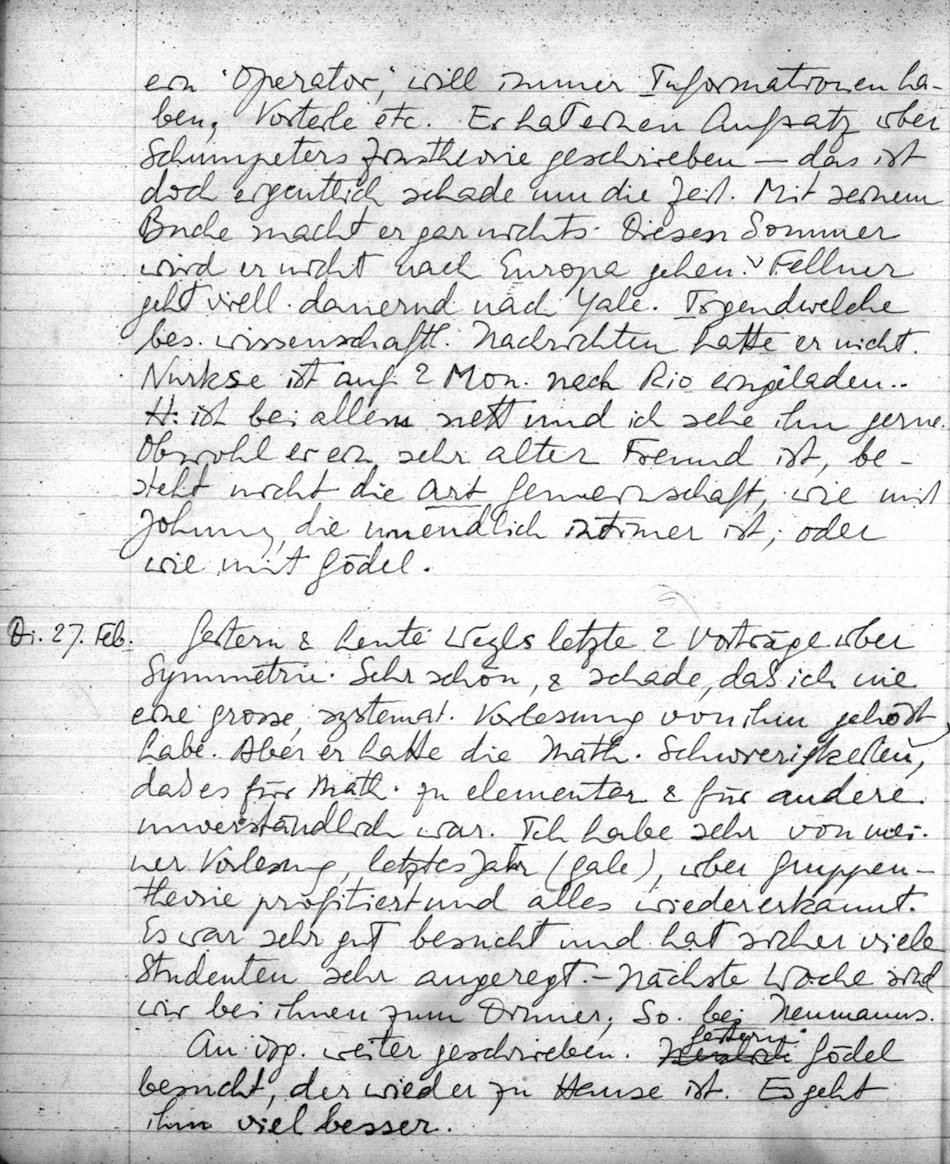Gestern & heute Weyls letzte 2 Vorträge über Symmetrie. Sehr schön, & schade, daß ich nie eine grosse, systemat. Vorlesung von ihm gehört habe. Aber er hatte die Math. Schwierigkeiten, daß es für Math. zu elementar & für andere unverständlich war. Ich habe sehr von meiner Vorlesung, letztes Jahr (Gale), über Gruppentheorie profitiert und alles wiedererkannt. Es war sehr gut besucht und hat sicher viele Studenten sehr angeregt. Nächste Woche sind wir bei ihnen zum Dinner; So. bei Neumanns.