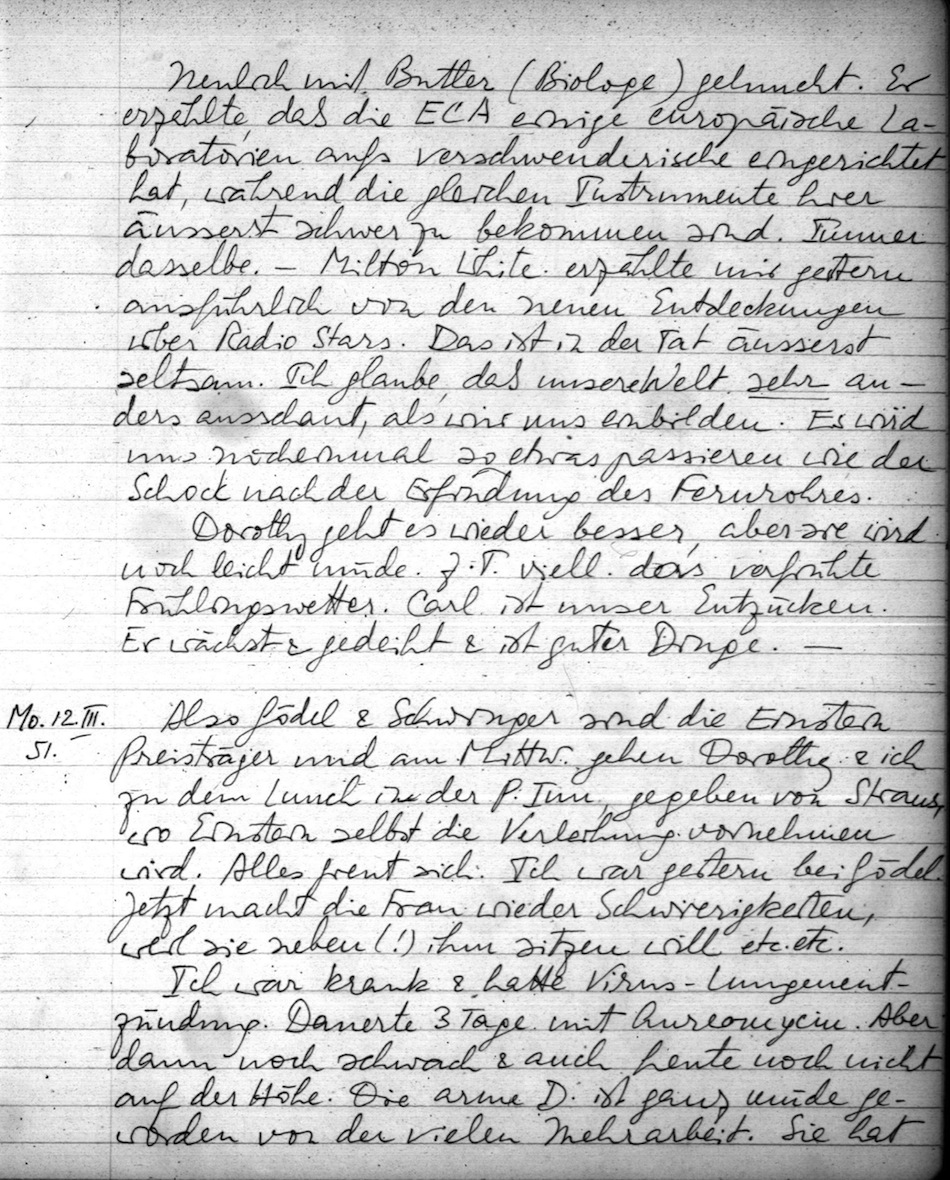 Also Gödel & Schwinger sind die Einstein Preisträger und am Mittw. gehen Dorothy & ich zu dem Lunch in der P. Inn, gegeben von Straus, wo Einstein selbst die Verleihung vornehmen wird. Alles freut sich. Ich war gestern bei Gödel. Jetzt macht die Frau wieder Schwierigkeiten, weil sie neben (!) ihm sitzen will etc. etc.