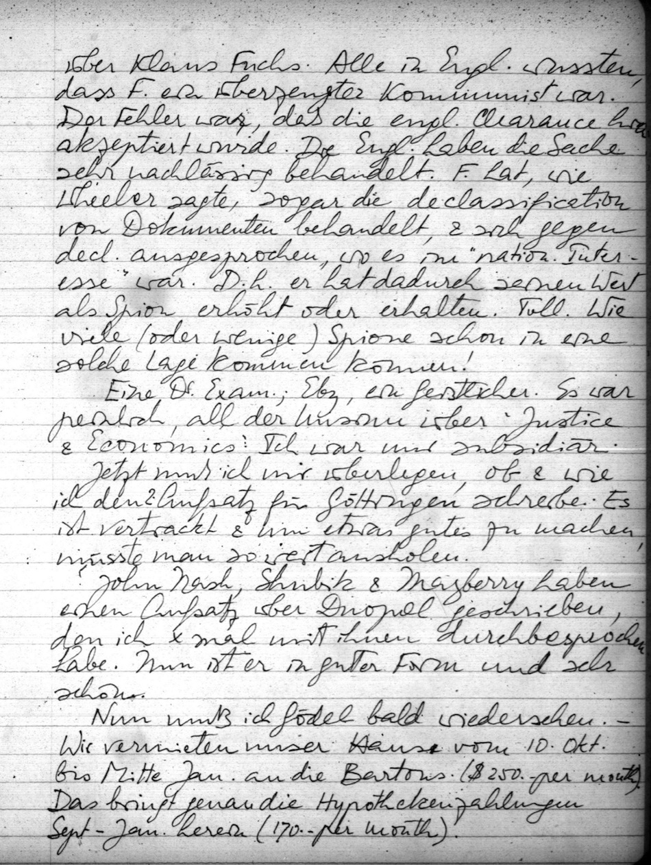 Mo. bei Spitzers zum Supper. Johnny war dort & wir hatten einige gute Unterhaltungen. Price (M. Born's Schwiegersohn) erzählte über Klaus Fuchs. Alle in Engl. wussten, dass F. ein überzeugter Kommunist war. Der Fehler war, daß die engl. Clearance hier akzeptiert wurde. Die Engl. haben die Sache sehr nachlässig behandelt. F. hat, wie Wheeler sagte, sogar die declassification von Dokumenten behandelt, & sich gegen decl. ausgesprochen, wo es im "nation. Interesse" war. D.h. er hat dadurch seinen Wert als Spion erhöht oder erhalten. Toll. Wie viele (oder wenige) Spione schon in eine solche Lage kommen können!