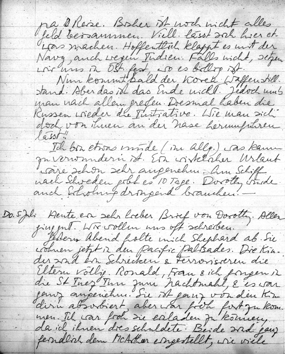 Heute ein sehr lieber Brief von Dorothy. Alles ging gut. Wir wollen uns oft schreiben. Gestern Abend holte mich Shephard ab. Sie wohnen jetzt in den Pacific Palisades. Die Kinder sind ein Schrecken & terrorisieren die Eltern völlig. Ronald, Frau & ich gingen in die St. Inez Inn zum Nachtmahl, & es war ganz angenehm. Sie ist ganz von den Kindern absorbiert, aber war froh fort zu kommen. Ich war froh sie einladen zu können, da ich ihnen dies schuldete. Beide sind ganz feindlich dem McAther eingestellt, wie viele hier. Mit dem Enthusiasmus scheint es nicht weit her gewesen zu sein.