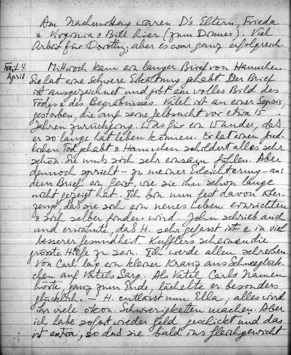 Mittwoch kam ein langer Brief von Hannchen. Sie hat eine schwere Erkältung gehabt. Der Brief ist ausgezeichnet und gibt ein volles Bild des Todes & des Begräbnisses. Vatel ist an einer Sepsis gestorben, die auf seine Gelbsucht vor etwa 15 Jahren zurückging. Was für ein Wunder, daß er so lange hat leben können. Er hat einen friedlichen Tod gehabt & Hannchen schildert alles sehr schön. Sie muß sich sehr einsam fühlen. Aber dennoch spricht zu meiner Erleichterung aus dem Brief ein Geist, wie sie ihn schon lange nicht gezeigt hat. Ich bin nun fest davon überzeugt, daß sie sich ein neues Leben einrichten & sich selber finden wird. John schrieb auch und erwähnte, daß H. sehr gefasst ist & in viel besserer Gesundheit. Kufflers scheinen die grösste Hilfe zu sein. Ich werde allen schreiben. Von Carl lag ein kleiner Kranz aus Schneeglöckchen auf Vatels Sarg. Als Vatel Carls Namen hörte, ganz zum Ende, lächelte er besonders glücklich. H. entlässt nun Ella; alles wird ihr viele ökon. Schwierigkeiten machen. Aber ich habe sofort wieder Geld geschickt und das ist extra, so daß sie bald ins Gleichgewicht kommen wird. Ich bin H. sehr zugetan und wünsche ihr von Herzen, daß sie nun ein leichteres Leben haben wird. Dabei wird sie ebensowenig wie die Eltern vergessen. Dorothy hat den Brief auch sehr bewundert; Vatels Tod hat einen tiefen Schatten über sie geworfen.