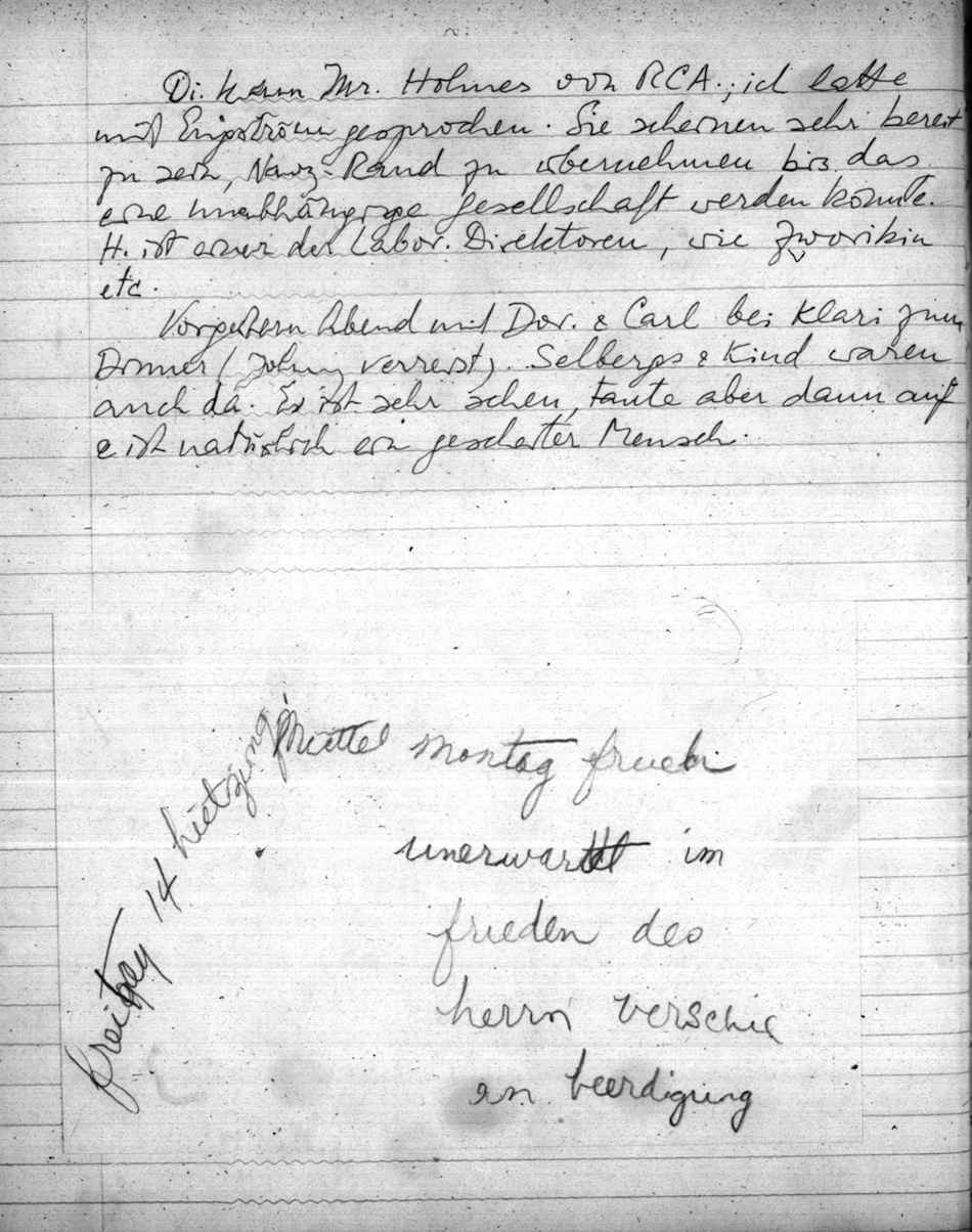 Di. kam Mr. Holmes von RCA; ich hatte mit Engström gesprochen. Sie scheinen sehr bereit zu sein, Navy-Rand zu übernehmen bis das eine unabhängige Gesellschaft werden könnte. H. ist einer der Labor Direktoren, wie Zworikin etc.