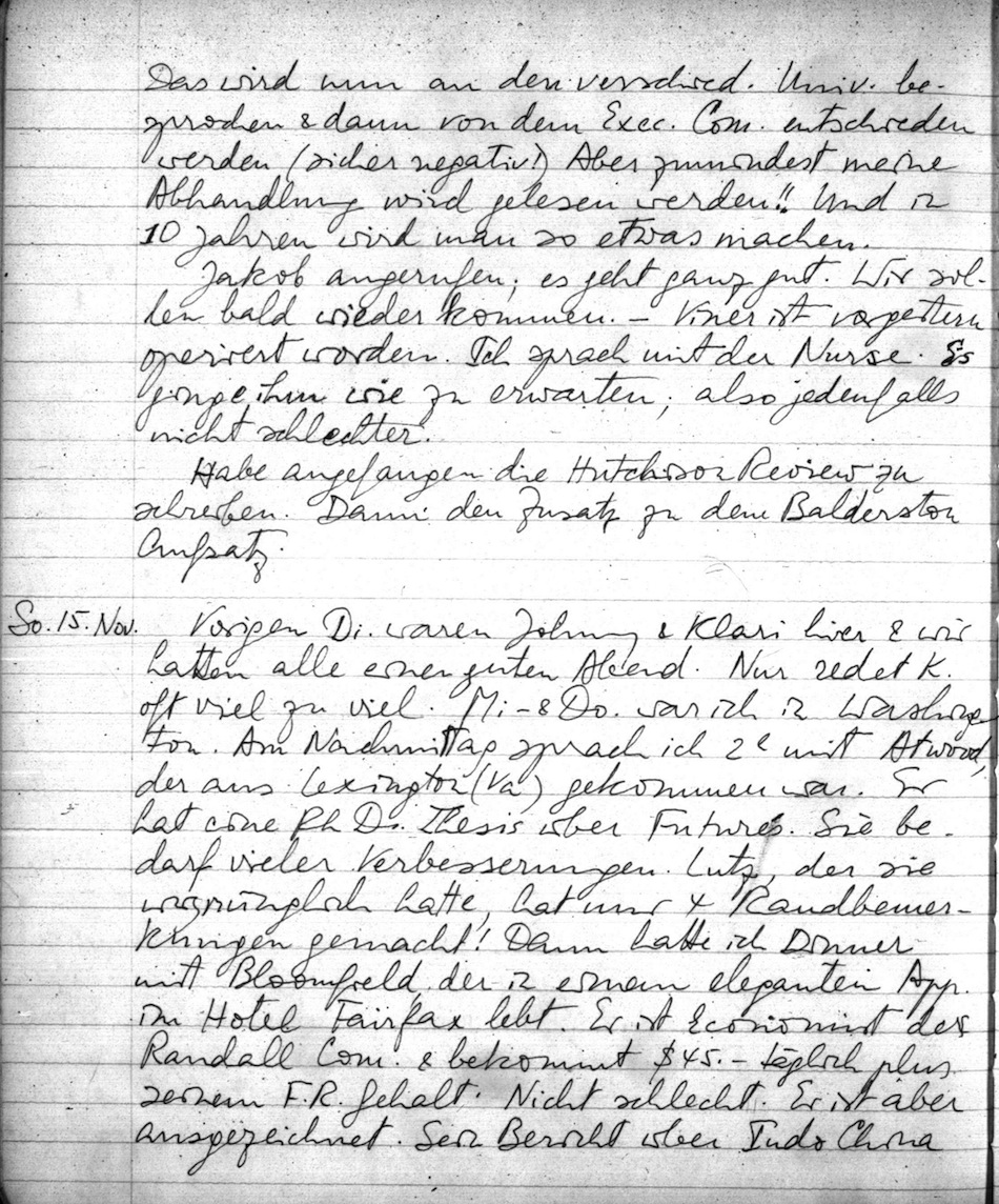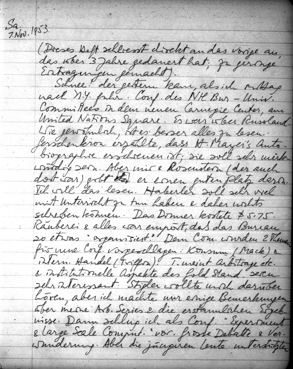 Schnee! der gestern kam, als ich mittag nach N.Y. fuhr. Conf. des Ntl. Bur. Univ. Committees in dem neuen Carnegie Center, am United Nations Square. Es war über Russland. Wie gewöhnlich, ist es besser alles zu lesen. Gerschenkron erzählte, dass H. Mayer's Autobiographie erschienen ist; sie soll sehr merkwürdig sein. Aber mir & Rosenstein (der auch dort war) gibt er einen guten Platz darin. Ich will das lesen. Haberler soll sehr viel mit Unterricht zu tun haben & daher nichts schreiben können. Das Dinner kostete $ 5.75. Räuberei & alles war empört, daß das Bureau so etwas "organisiert". Dem Com. wurden 2 Themen für neue Conf. vorgeschlagen: Konsum, (Mack) & intern. Handel (Triffin). T. meint Arbitrage etc. & institutionelle Aspekte des Gold Stand. seien sehr interessant. Stigler wollte mich darüber hören, aber ich machte nur einige Bemerkungen über meine Arb. Series & die erstaunlichen Ergebnisse. Dann schlug ich als Conf. "Experiment & Large Scale Comput." vor. Grosse Debatte & Verwunderung. Aber die jüngeren Leute unterstützten. Das wird nun an den verschied. Univ. besprochen & dann von dem Exec. Com. entschieden werden (sicher negativ!) Aber zumindest meine Abhandlung wird gelesen werden!! Und in 10 Jahren wird man so etwas machen.