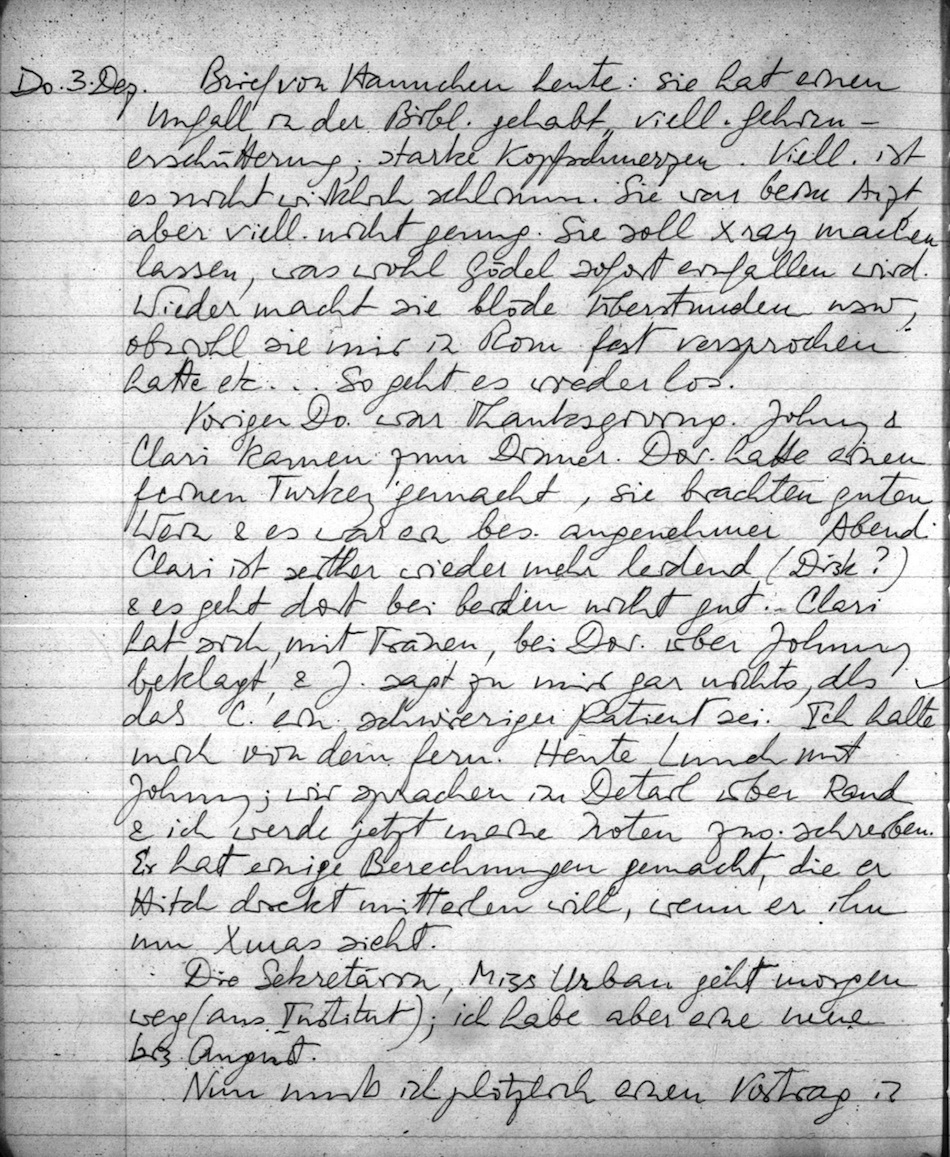 Vorigen Do. war Thanksgiving. Johnny & Clari kamen zum Dinner. Dor. hatte einen feinen Turkey gemacht, sie brachten guten Wein & es war ein bes. angenehmer Abend. Clari ist seither wieder mehr leidend (Disk?) & es geht dort bei beiden nicht gut. Clari hat sich, mit Tränen, bei Dor. über Johnny beklagt, & J. sagt zu mir gar nichts, als daß C. ein schwieriger Patient sei. Ich halte mich von dem fern. Heute Lunch mit Johnny; wir sprachen im Detail über Rand & ich werde jetzt meine Noten zus.schreiben. Er hat einige Berechnungen gemacht, die er Hitch direkt mitteilen will, wenn er ihn um Xmas sieht.